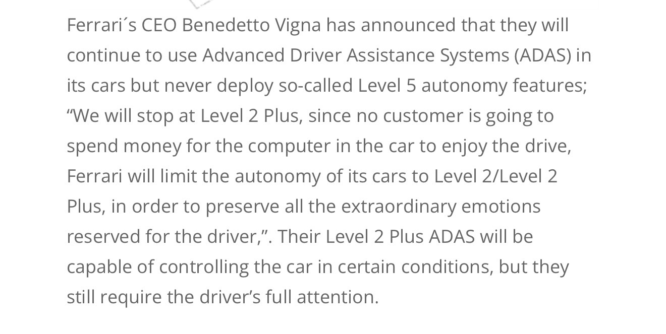 深夜睡不着,我在想「法拉利会使用智驾吗」没想到法拉利CEO还真回答过这么无聊的问题: 🔻会,但将止步于L2+。法拉利认为任何高于L2+的智驾会阻碍驾驶乐趣,客户并不愿花钱购买。法拉利也将永不使用L5级的智驾震惊。法拉利还挺开明的,愿意用到L2+。我还以为法拉利会非常排斥任何智驾