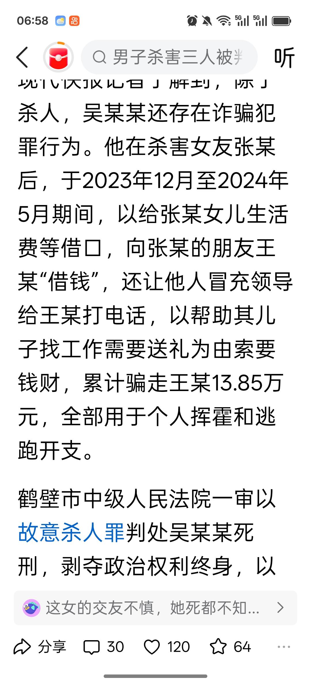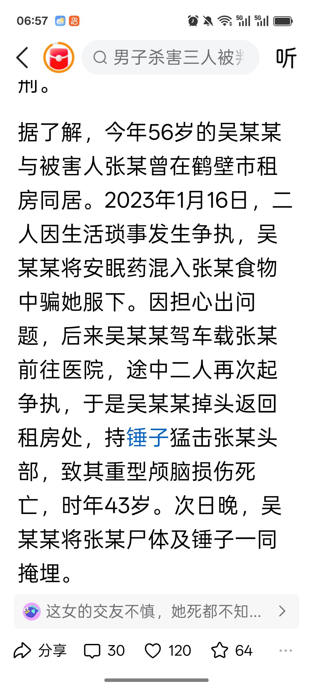 真为这一家人的智商着急! 河南鹤壁吴某某杀害同居女友一家三口,被判死刑并于近日押赴刑场执行。说起来这个吴某某,也算是老牛吃嫩草了,案发时他54岁,同居女友张某某43岁。正所谓老夫少妻,不是应该捧在手心供起来吗? 结果因为琐事,他就用安眠药将张某某迷晕,然后残忍杀害埋尸荒野。张某某的女儿(殁年18岁)、儿子(殁年20岁)知道母亲与吴某某同居,长期联系不上母亲,上门打听消息未果,也被吴某某用安眠药迷晕杀害。 这一家三口被吴某某灭门了!说起来真可怜,张某某识人不明,惹来杀身之祸。一双儿女都已经成年,却对吴某某缺乏警惕之心,喝下仇人配制的安眠药水,最终命丧黄泉。(这个吴某某职业也并非医生,怎么那么容易就弄到安眠药?我经常失眠,医生一次给我开两天的量,麻烦得很。) 吴某某虽然已经明正典型,可惜三人已逝,为时已晚。我读过明清律例,杀一家三口无辜者,刑罚是凌迟处死,这个吴某某如果生活在明清,有他好受的。