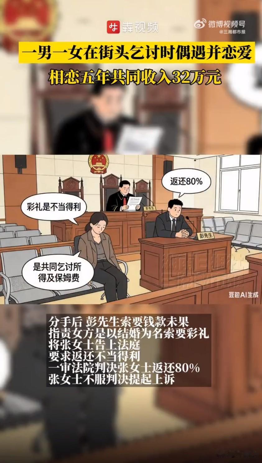 最近一男一女在街头乞讨时偶遇并恋爱的话题直接冲上热搜,跟着二人因乞讨相恋五年共同收入32万元和乞讨男给乞讨女11万彩礼发现其未离婚的词条一起刷屏,这剧情反转比电视剧还抓马,网友都调侃“现实永远比剧本离谱”! 故事的主角是彭先生和张女士,两人都是在街头乞讨谋生的人。彭先生当时已经离异,独自在街头讨生活,偶然间遇到了同样乞讨的张女士。同是天涯沦落人的境遇让两人迅速拉近距离,张女士说自己也和前夫离了婚,惺惺相惜的两人很快就确定了恋爱关系,还以夫妻名义同居,搭伙开启了“乞讨搭档”的日子。他们有时候在车站、医院这些人流密集的地方一起乞讨,有时候也分头行动,赚来的钱都统一保管,风里来雨里去一起打拼了五年,居然攒下了32万元的共同收入,这个数字直接打破了大家对乞讨者“收入微薄”的固有印象,网友调侃:“这比不少打工人五年攒的还多,真是万万没想到”。 感情稳定后,张女士向彭先生提出要20多万元的彩礼筹备结婚,满心欢喜想组建家庭的彭先生没多想,先后分多次给张女士转了11.19万元。本以为好日子就要来了,可没过多久两人感情突然破裂,更让彭先生崩溃的真相浮出水面——张女士压根就没和前夫离婚,一直处于婚姻存续状态! 得知自己被蒙在鼓里,彭先生又气又急,觉得自己是被欺骗了,多次找张女士想要回这笔彩礼,可对方始终拒绝。张女士说这笔钱不是彩礼,而是两人五年共同乞讨所得的分成,再加上自己照顾彭先生的“保姆费”,但她拿不出任何证据来证明自己的说法。协商无果后,彭先生只能一纸诉状把张女士告上了法庭,要求返还这笔不当得利。 法院审理时,彭先生提交了完整的转账记录和聊天记录,清晰能证明这笔钱是为了结婚才给的彩礼。一审法院最终酌定张女士返还80%的钱款,也就是89536元。可张女士不服这个判决,提起了上诉。直到后来,宁夏固原市中级人民法院经过审理,认为彭先生的证据确凿,而张女士的上诉理由没有有效证据支撑,最终驳回了上诉,维持原判。 这事儿曝光后网友都炸开了锅,有人替彭先生惋惜:“五年真心喂了狗,不仅感情被骗,还差点成了第三者”,也有人被“乞讨五年赚32万”惊到:“这收入让打工人情何以堪,果然职业乞讨藏着门道”。原本以为是底层相互取暖的温情故事,没想到藏着这么大的谎言,只能说不管是什么关系,真诚才是底线,任何建立在欺骗上的感情,终究会翻车。 这起从街头乞讨开始的感情,最后闹到法庭收场,真是让人唏嘘。本来俩人为了生活一起努力的样子还算励志,可偏偏因为一方的隐瞒和贪心,把好好的日子过成了纠纷,最后落得个两败俱伤的结局。流浪乞讨人 乞丐情侣 情侣乞丐 来源:三湘都市报