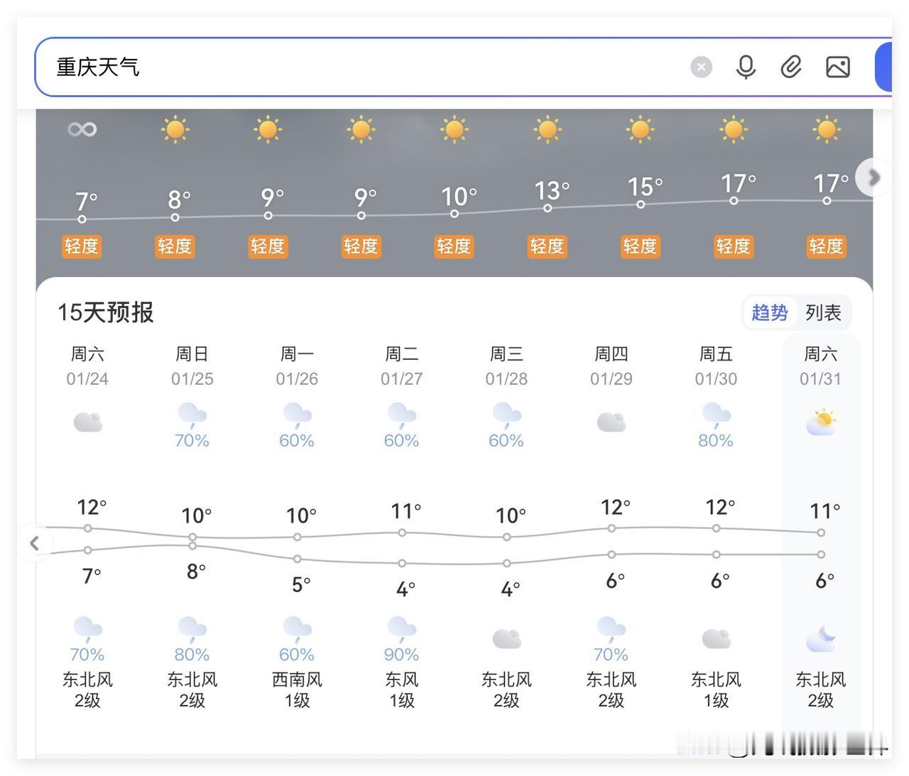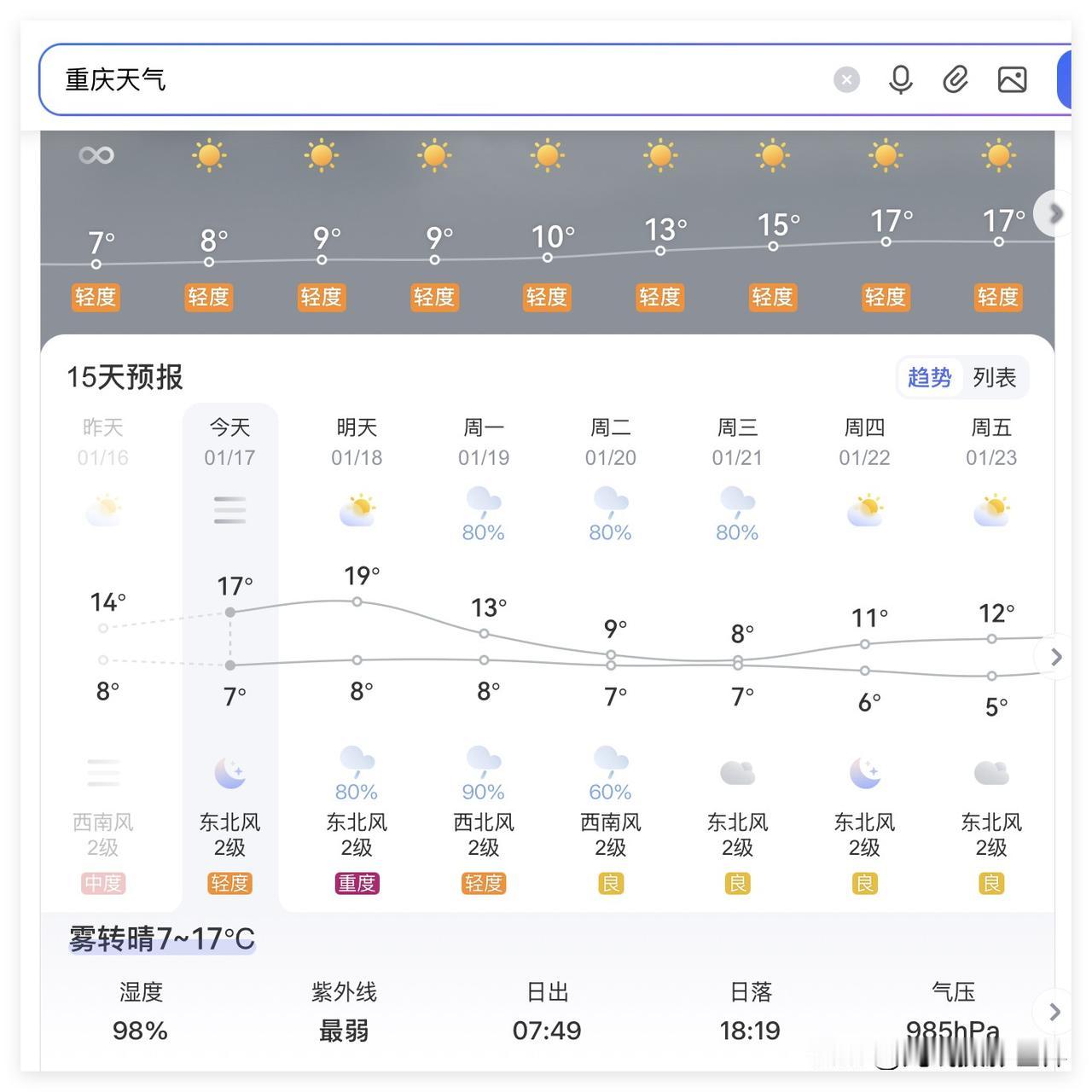 啊啊啊!重庆,真的要大降温啦!虽然1月17日和18日的重庆主城区,最高气温冲刺20度……但是,1月19日,星期一,重庆降雨降温……1月20日,星期二,重庆气温跌至7-9度……降温幅度约10度,断崖式大降温,气温腰斩啊! 新一轮雨雪天气来袭,长江流域……大范围雨雪天气……重庆主城区周边的高山,仙女山,金佛山,南天湖,武陵山……可能会下雪啊! 重庆的三九暖冬,要彻底终结啦! 重庆的四九寒冬,真的会好冷啊! 哎呀~!