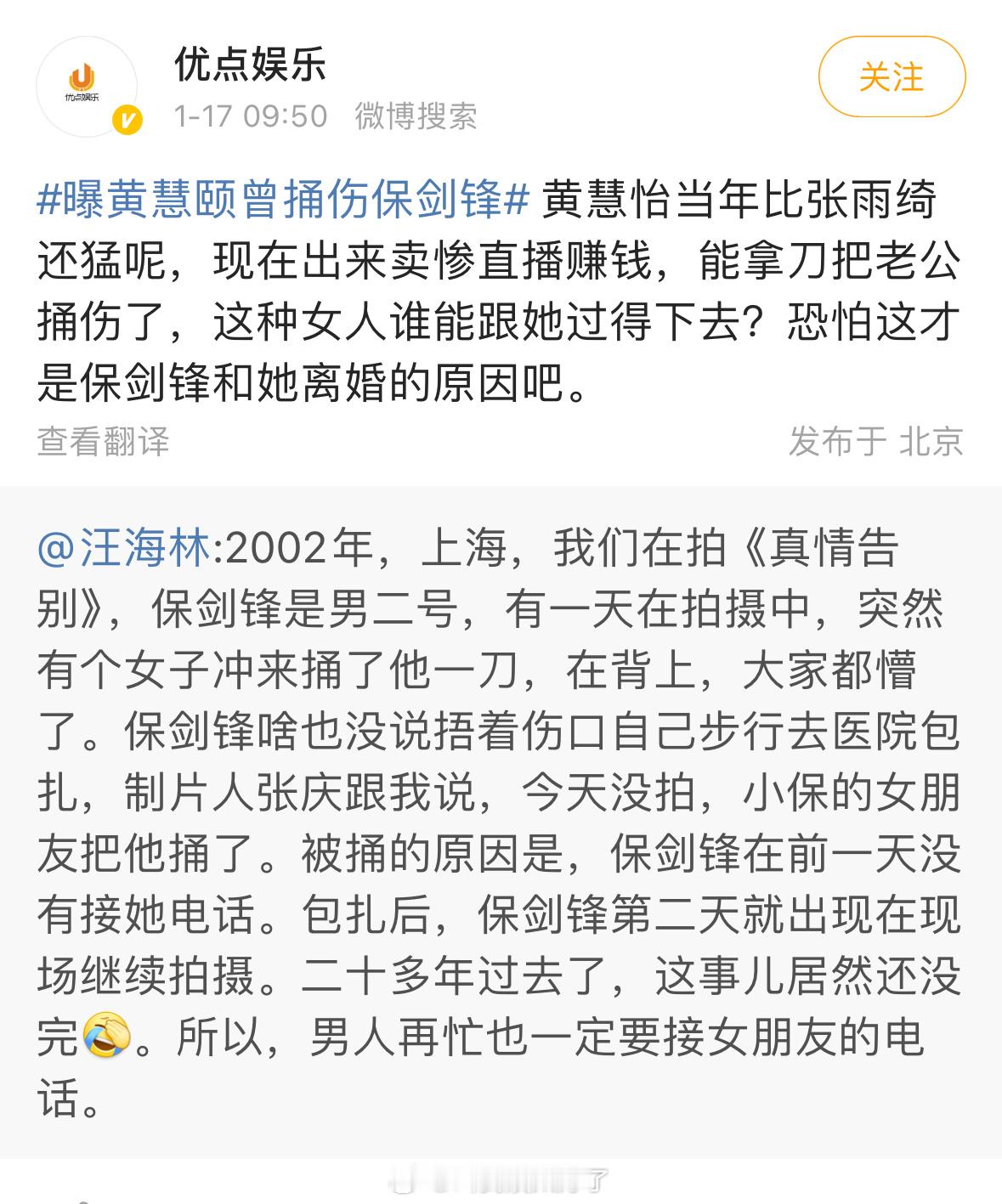 狗仔说保剑锋曾经被前妻捅伤。啊?