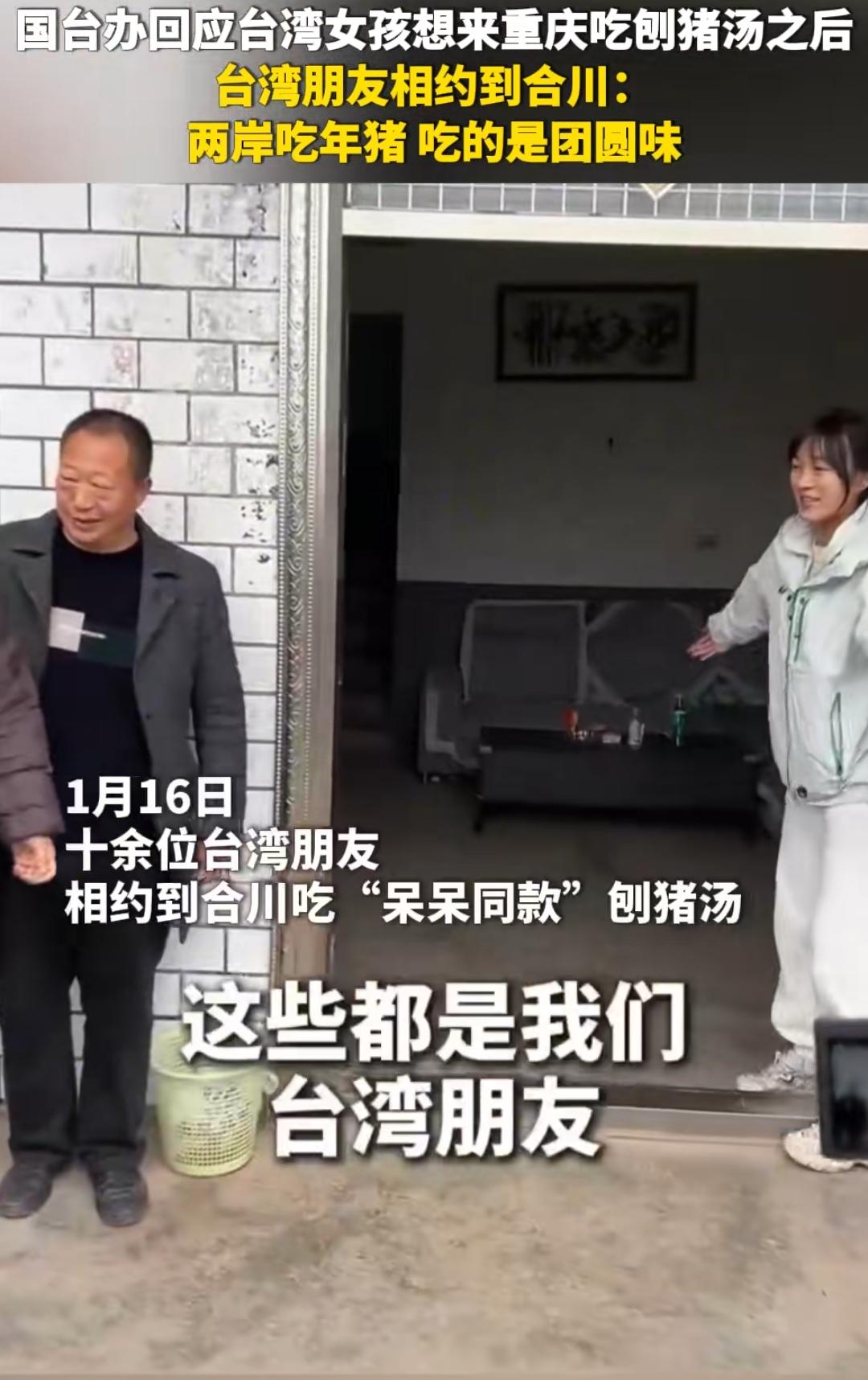 台湾女孩想来重庆吃刨猪汤,国台办回应,这种两岸民众之间基于同胞情的双向互动,就是两岸交流真正的底色 。 1月16日,十余位台湾朋友相约到合川吃"呆呆同款"刨猪汤。其中,红烧肥肠、肝腰合炒、莴笋炒肉丝深受台湾青年喜爱,台胞杨京儒说:"我推荐大家吃一整桌!