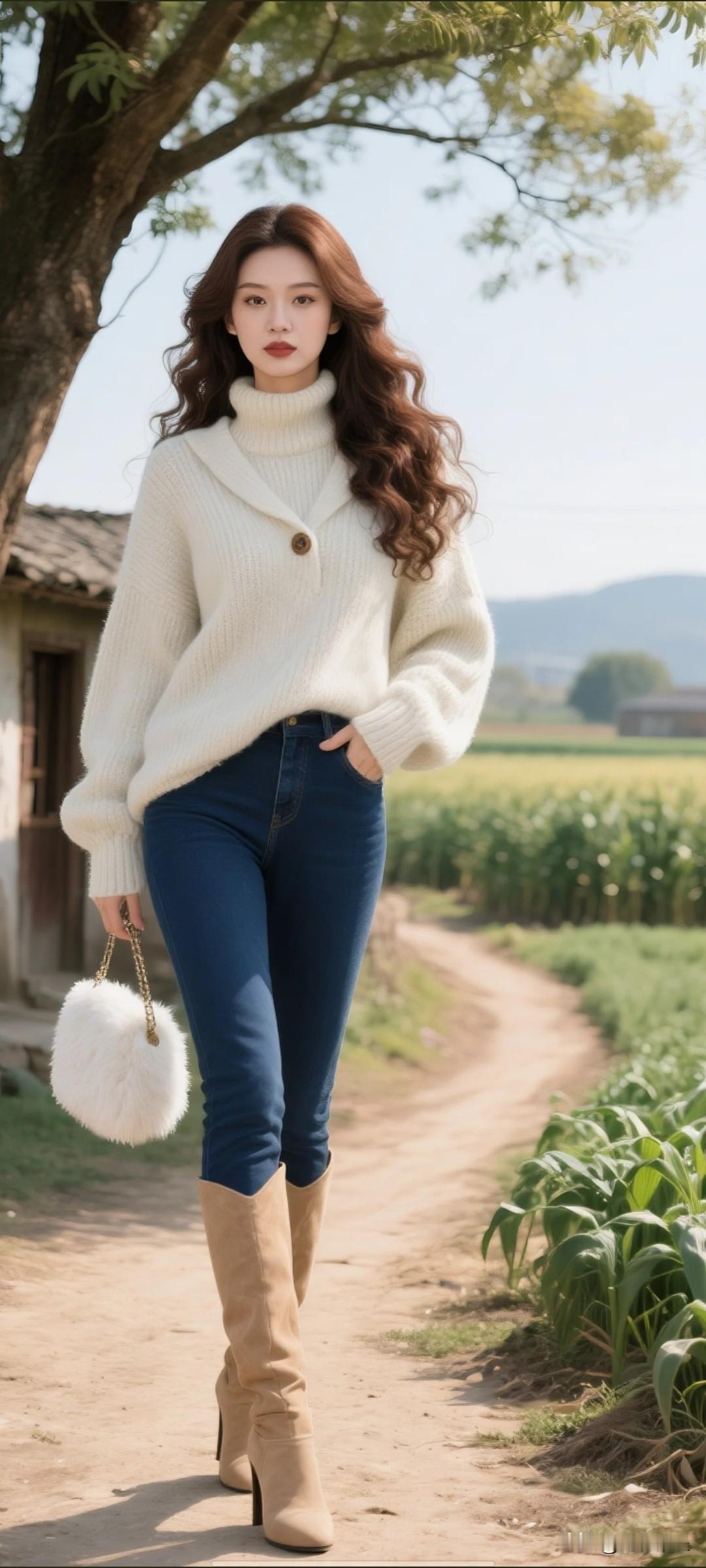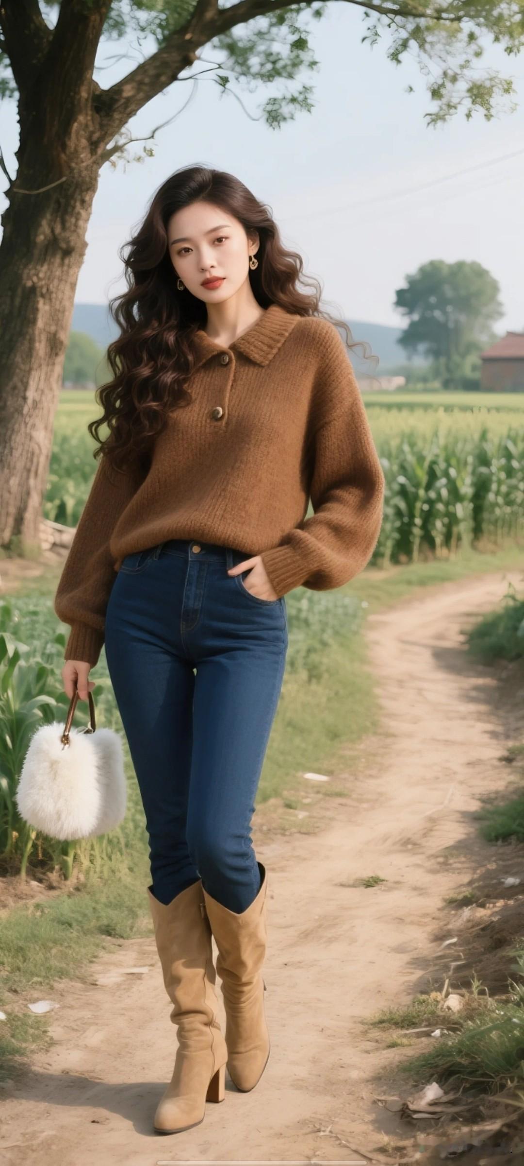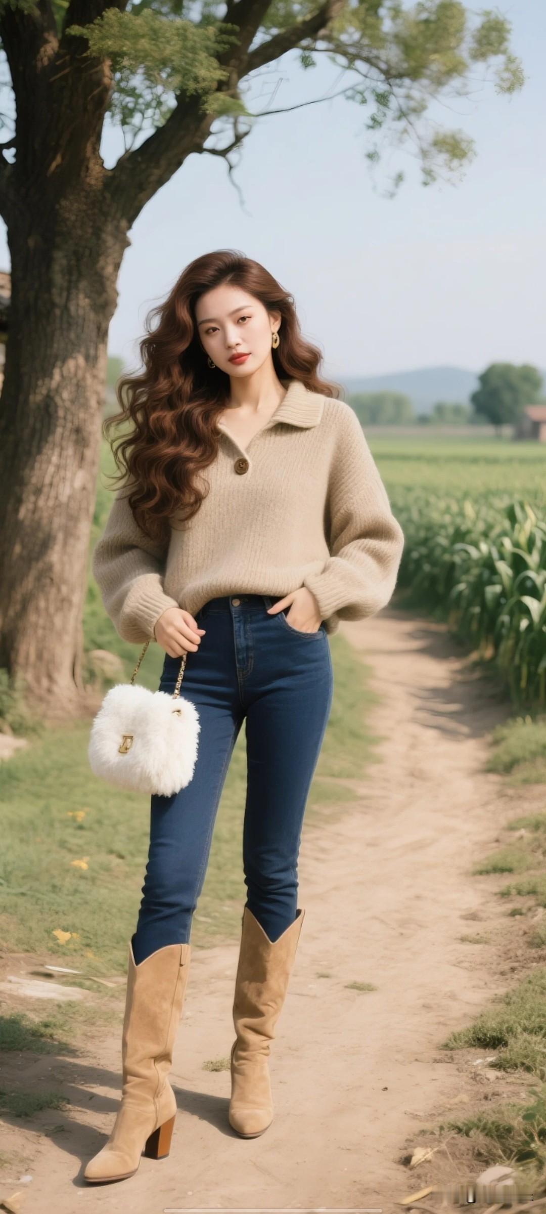 晒图笔记大赛26岁中国御姐,棕色大波浪卷发及腰,冷白皮+精致妆容,毛衣是大翻领+单侧纽扣的设计,宽松版型营造出慵懒感,深蓝色铅笔裤,搭配毛绒白色小包增加了冬日的软糯质感,脚踩卡其色高跟靴。 背景在90年代农村,,夏季中午,一棵大树,,小院外面庄稼地,小土路,全景高清。什么样的穿搭可以成为气质女神? 气质穿搭怎么穿才恰到好处?