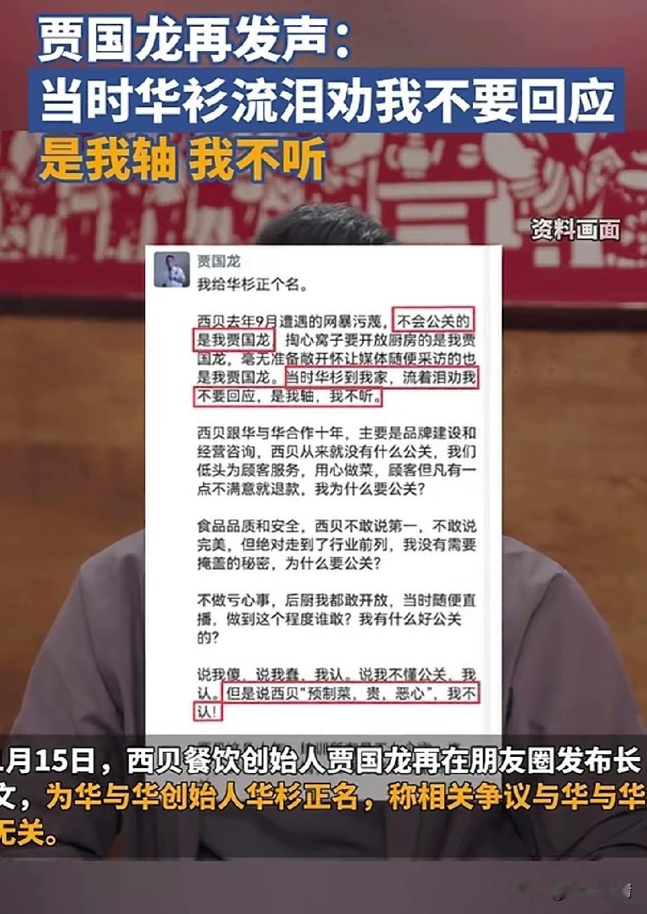 西贝贾国龙在朋友圈为华与华正名, 他说当时西贝的开放厨房, 都是自己比较轴, 自己的一意孤行, 当时华与华咨询公司都劝他不要回应, 但是当时他不听, 他自己非要回应, 这才惹出了轩然大波, 根本不是华与华的错, 当时谁替西贝说话, 谁就会被舆论攻击, 他和华与华的老板已经合作了10年, 两个人也是非常好的朋友, 所以说大家不要再说华与华把西被公关坏了,跟人家没有关系, 并且最近西贝的公关副总裁已经离职, 可以说这次西贝的贾国龙自己说出了真相! 大家觉得贾国龙替华与华公司澄清可信吗? 西贝 西贝贾老板 西贝翻车
