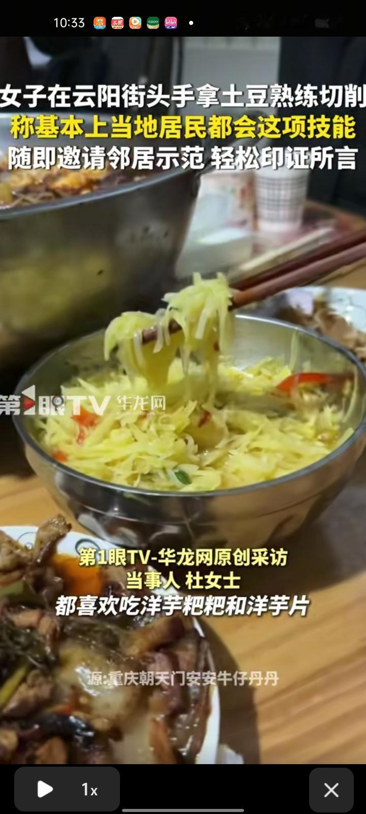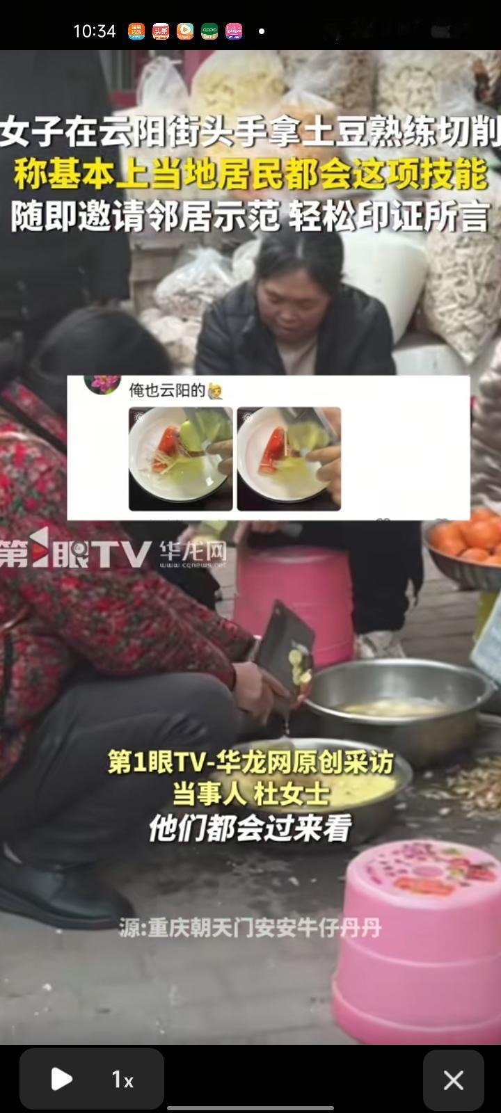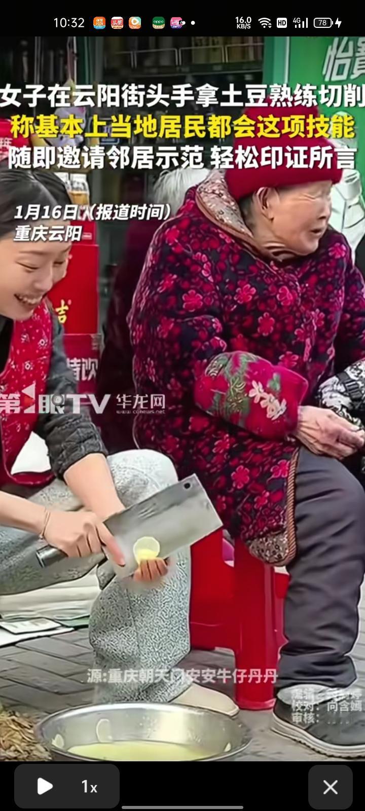 1月15日,重庆市云阳县。女子在街头手拿土豆熟练切割,平时他们都喜欢吃洋芋粑粑和洋芋片,基本上当地居民都会这项技能,随即邀请邻居示范,轻松印证所言