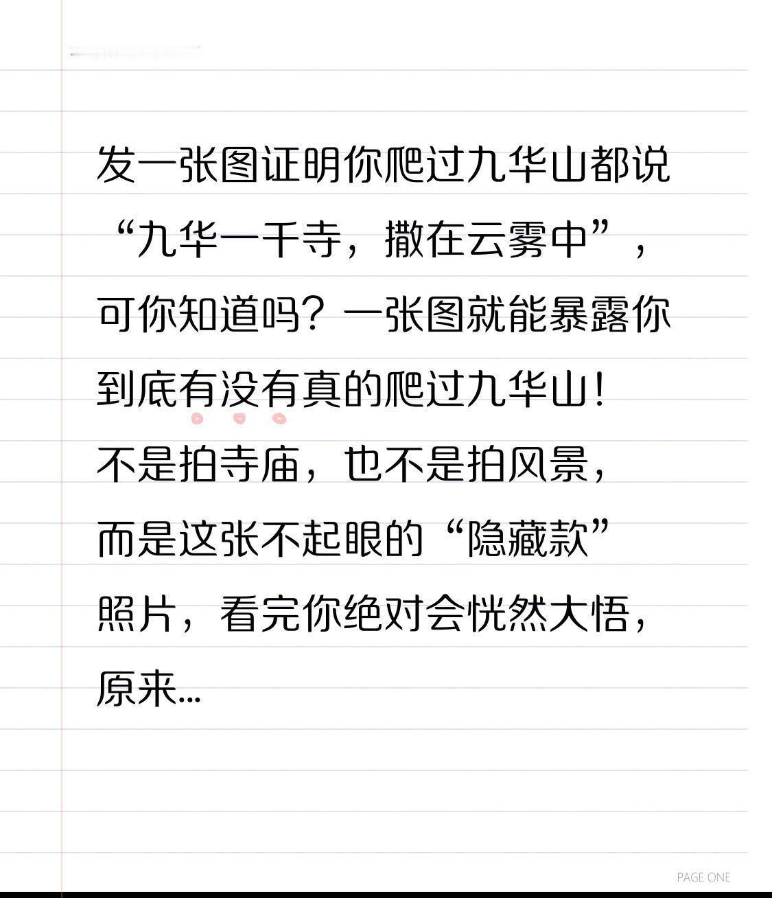 发一张图证明你爬过九华山 都说“九华一千寺,撒在云雾中”,可你知道吗?一张图就能暴露你到底有没有真的爬过九华山!不是拍寺庙,也不是拍风景,而是这张不起眼的“隐藏款”照片,看完你绝对会恍然大悟,原来自己错过了这么多! 很多人爬九华山,都会拍雄伟的寺庙,像祇园寺那金黄的殿宇,在绿树掩映下格外壮观;或者拍百岁宫,那建在悬崖上的建筑,看着就让人惊叹。还有花台景区的高空栈道,走在上面,仿佛置身云端,风景美不胜收,随便一拍都能刷爆朋友圈。这些照片确实很美,也能证明你来过九华山,但却不能真正证明你“爬过”九华山。 我有个朋友,第一次去九华山,回来晒了一堆美照,寺庙、云海、日出,啥都有,可仔细一看,却少了关键的东西。他都是坐缆车上下山,虽然欣赏到了山顶的风光,却没体验到爬山的乐趣和艰辛。而那些真正爬过九华山的人,手机里一定有这样一张照片:一段望不到头的陡峭台阶,台阶两旁是茂密的树林,自己的双脚踩在满是青苔的石板上,鞋子上还沾着泥土。 是的,九华山的台阶才是它的灵魂。从九华街到百岁宫,从凤凰松到天台寺,那一级级台阶,是无数 pilgrims(朝圣者)用脚步丈量信仰的印记。每一步都饱含着汗水,每一次喘息都伴随着对山顶的期待。当你爬得精疲力尽,双腿像灌了铅一样沉重,却依然咬牙坚持,终于到达一个休息平台,这时低头拍下自己的双脚和眼前的台阶,那才是最珍贵的回忆。 我自己就有这样一张照片,那是我在爬天台峰的途中,实在走不动了,坐在台阶上休息时拍的。看着照片中自己那双满是灰尘的运动鞋,和延伸向远方的台阶,我突然明白,爬九华山的意义,不在于看到了多少美景,而在于这一路的坚持和挑战。这张照片没有美丽的风景,没有宏伟的建筑,却记录了我最真实的爬山历程,也让我对九华山有了更深的情感。 所以,如果你问我,发一张图证明你爬过九华山,我会毫不犹豫地拿出这张台阶的照片。因为它不仅是我征服九华山的见证,更是我人生路上克服困难的象征。我相信,每一个真正爬过九华山的人,都能在这张照片中找到共鸣。它让我们想起那些汗水与坚持的时刻,让我们明白,只要有勇气前行,再高的山也能征服。 朋友们,你们手机里有没有这样一张能证明自己爬过九华山的照片呢?欢迎在评论区分享,让我们一起回忆那些难忘的爬山时光。点赞、收藏并转发给身边的朋友,让更多人了解九华山的魅力,也让更多人有勇气去挑战这座神圣的山峰。