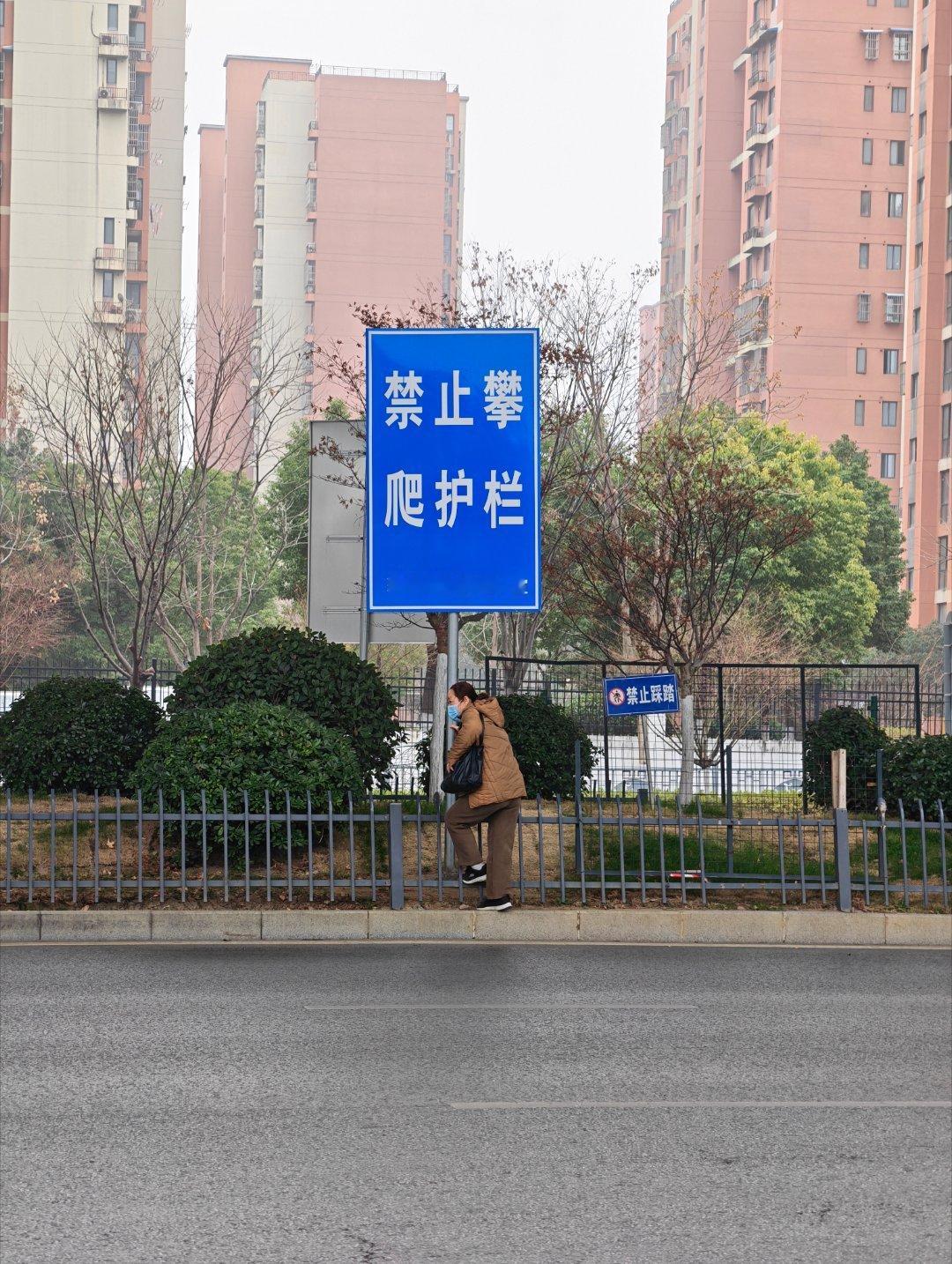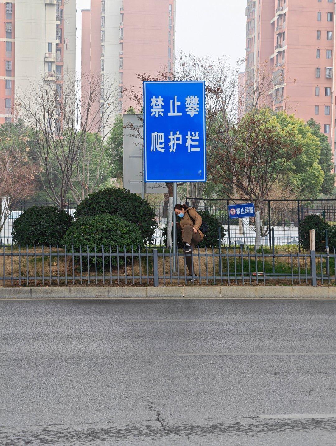 这位女士正在用亲身示范,为大家讲解什么是“禁止攀爬护栏”——属于沉浸式教学了。 芜湖