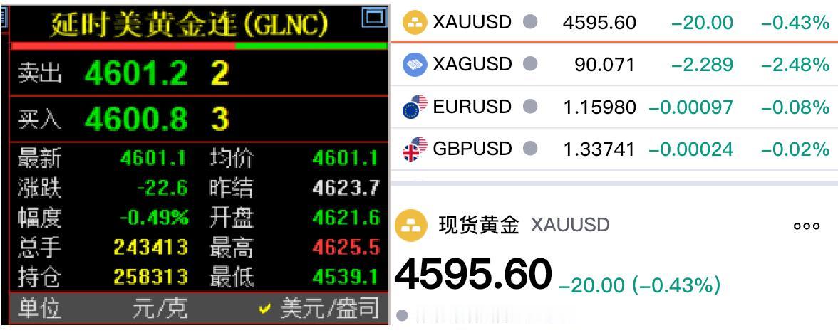 今天是周六, 周五外盘金价已经收盘。 不过国际金价(纽约黄金) 和伦敦金(现货黄金) 齐刷刷回落, 但是一个在四千六上方, 一个位于其下方。 国际金价收盘于4601.1美元, 现货黄金收盘于4595.6美元。 对于黄金, 期货小褚认为震荡运行, 关注上方压力情况比较好!