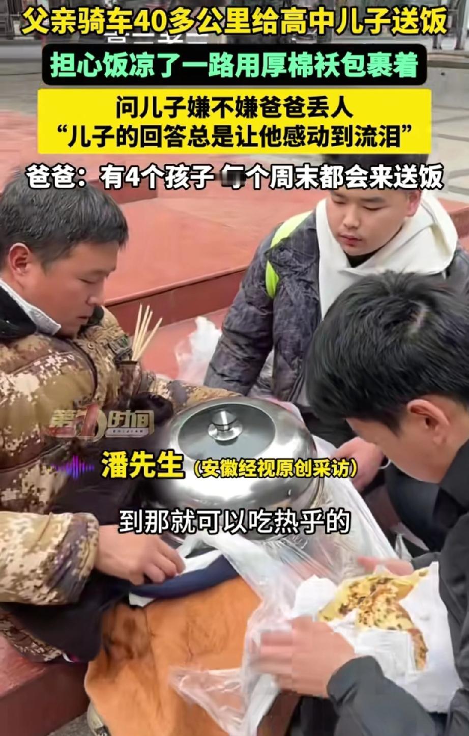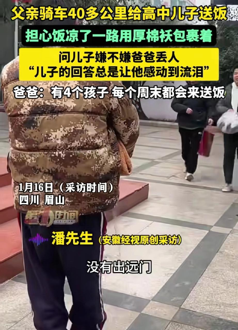 可怜天下父母心!四川眉山,一男子有四个孩子,因为上高中的儿子周末学校没有饭,于是他一到周末就会在家里做一锅的饭菜,用棉被包好后骑车40公里送过来,有时候男子担心自己太丢人,可孩子的回答却让他心里暖暖的 潘先生有四个孩子,为了多陪伴家人,他选择在家附近干活,没有外出远行。他的两个儿子在县城高中住校,每到星期天下午,学校不提供伙食,孩子吃饭就成了问题。这件小事,成了父亲心里放不下的牵挂。 于是,每个周末都上演着这样温暖的一幕:家里灶台上的饭菜一出锅,冒着热气,潘先生就赶紧找来厚厚的棉被和旧衣服,把饭锅一层层仔细裹紧,然后稳稳地放进自行车篮里。他骑上那辆旧自行车,一趟就是四十公里,心里只反复念叨着一件事:可别让饭凉了。 有时候,站在光鲜的学校门口,看着自己简朴的衣着和那辆旧自行车,他心里也会犯嘀咕:孩子会不会觉得这样丢脸? 他小心翼翼地问儿子:“你会不会嫌爸爸这样送饭,有点丢人啊?” 儿子的回答没有半点犹豫,朴实却充满力量:“我没感觉爸爸丢人啊!” 这句话,像冬日里的暖流,瞬间驱散了父亲所有的不安与辛劳。 父母会害怕,怕自己的爱不够“体面”,怕给已经长大的我们“丢份儿”。但真正懂事的孩子,眼睛是清澈的。他们看到的从来不是方法的“土气”或形式的“寒酸”,而是那背后热气腾腾、毫无保留的心意。 他们懂得,棉被里包裹的、饭盒里装着的,从来不只是简单的饭菜,而是父母舍不得说出口的牵挂,是“家”最具体、最温暖的温度。 生活里真正能支撑我们走下去的,往往就是这些“不嫌麻烦”的来回与守护。父亲那辆旧自行车蹬过的四十公里,母亲在手机上反复练习的打字,这些看似微小的细节,共同编织成了我们人生中最坚固的安全网。 很多年后,父亲老了,孩子飞远了,但这份用棉被包裹着的温暖,这份藏在笨拙细节里的深爱,会成为彼此心里永远都不会凉掉的记忆。父母之爱,朴素如山,却重逾千斤。它或许沉默,却震耳欲聋。
