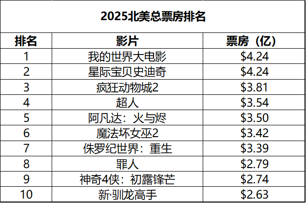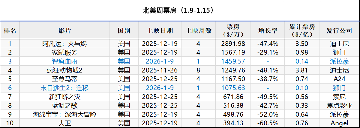 2026年第2周北美票房:1.《阿凡达3》四连冠,累计票房3.5亿美元排名2025年度第5,全球票房超12亿;2.《疯狂动物城2》全球票房超16亿;3. 派拉蒙恐怖片《猩疯血雨》在新片中成绩最佳。(数据:boxofficemojo)