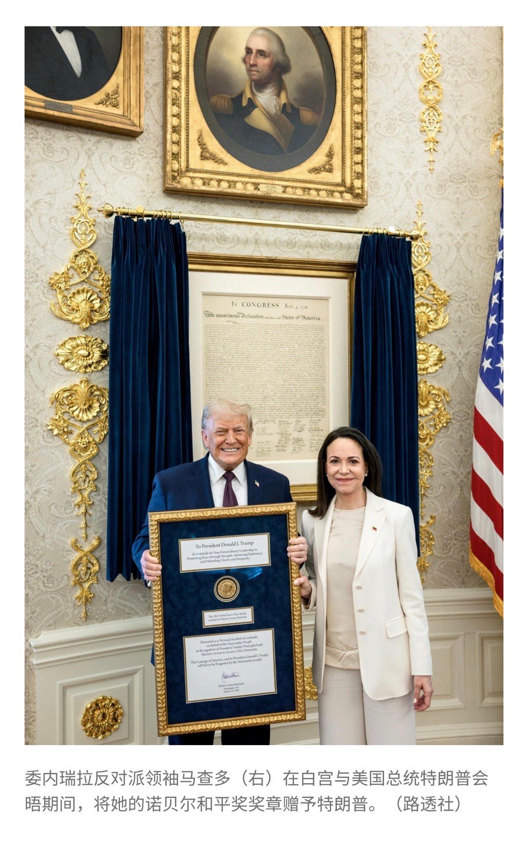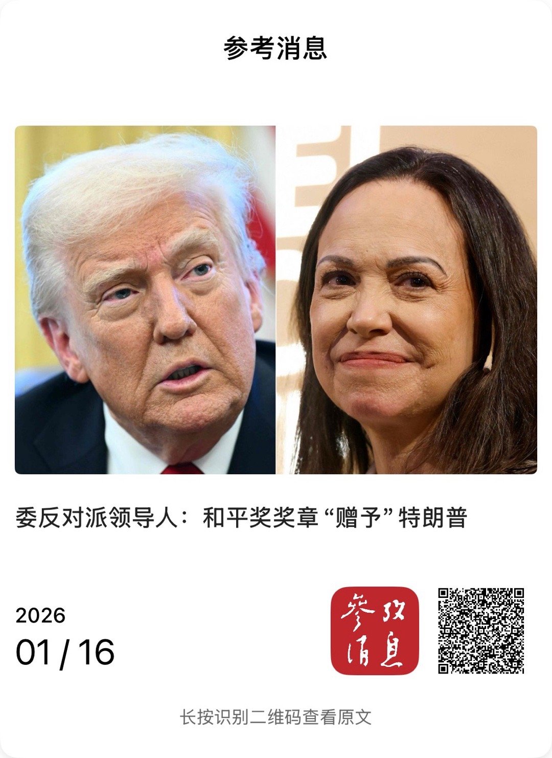 【委反对派领导人:和平奖奖章“赠予”特朗普】 (参考消息 2026-01-16 12:36:53 ) 参考消息网1月16日报道 据法新社1月15日报道,委内瑞拉反对派领导人玛丽亚·科丽娜·马查多15日称,将诺贝尔和平奖奖章“赠予”美国总统特朗普,而后者仍将她排除在委内瑞拉的战略考量之外。 报道称,马查多当天在与特朗普共进午餐后前往美国国会。她在国会大厦外对记者们说:“我已将诺贝尔和平奖奖章赠予美国总统。”被问到公开觊觎这一奖项的特朗普会否保存这一奖章时,马查多没有给出答复。 但挪威诺贝尔委员会15日在社交平台X上随即表示,获奖者可以让自己看中的人保有奖章。不过该机构也强调:“奖章可以易手,但是奖项不能转让。” 报道还称,特朗普与马查多的午餐,被美国方面认为只是应酬之举,而且没有媒体在现场。 马查多于当地时间中午12时抵达白宫,随后在下午14时30分左右离开。她表示:“我向他保证,委内瑞拉人想要在法治下自由而有尊严地生活。为了达成此目标需要民主。” 报道提及,在强行控制马杜罗并将其关押在美国后,特朗普认为,去年12月秘密离开委内瑞拉去领取诺贝尔奖的马查多不适合领导这个国家。 特朗普目前排除了委内瑞拉提前进行大选的可能性,倾向于“左右”当下加拉加斯领导人团队的决策直至新秩序的建立。 特朗普14日曾同委内瑞拉代总统德尔西·罗德里格斯进行了“长时间交谈”。他夸赞这位前副总统是一个“非常出色的人”。罗德里格斯15日则提到,会对与石油有关的法律进行“部分改革”,而石油是华盛顿希望控制的委内瑞拉主要资源。 (编译/芦龙军)网页链接 另据新加坡联合早报16日报道,英国广播公司(BBC)在报道中称,马查多星期四(1月15日)在会晤结束后说:“我认为今天对我们委内瑞拉人来说是历史性的一天。”随后,曾多次公开表达希望得到诺贝尔和平奖的特朗普,在社交媒体发文表达感谢,称收到奖章是“一种体现相互尊重的美好举动”。 联合早报的报道说,挪威对马查多将奖章赠予特朗普的消息表示难以置信。奥斯陆大学教授、前政界人士简妮·哈兰德·马特拉里(Janne Haaland Matlary)对挪威广播公司说,“这完全是闻所未闻。”她称此举“毫无意义”且“可悲”,并指出“此举完全是对该奖项的蔑视”。