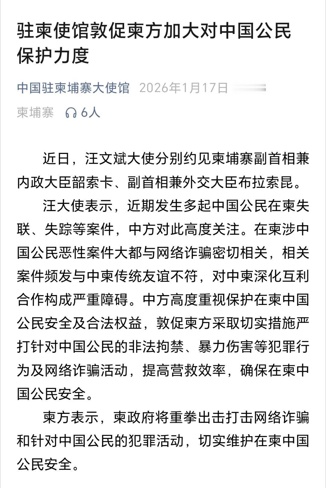 多名中国公民在柬失联失踪汪文斌大使约见柬副首相 中国驻柬埔寨大使约见柬副首相、敦促柬方加大对中国公民保护力度