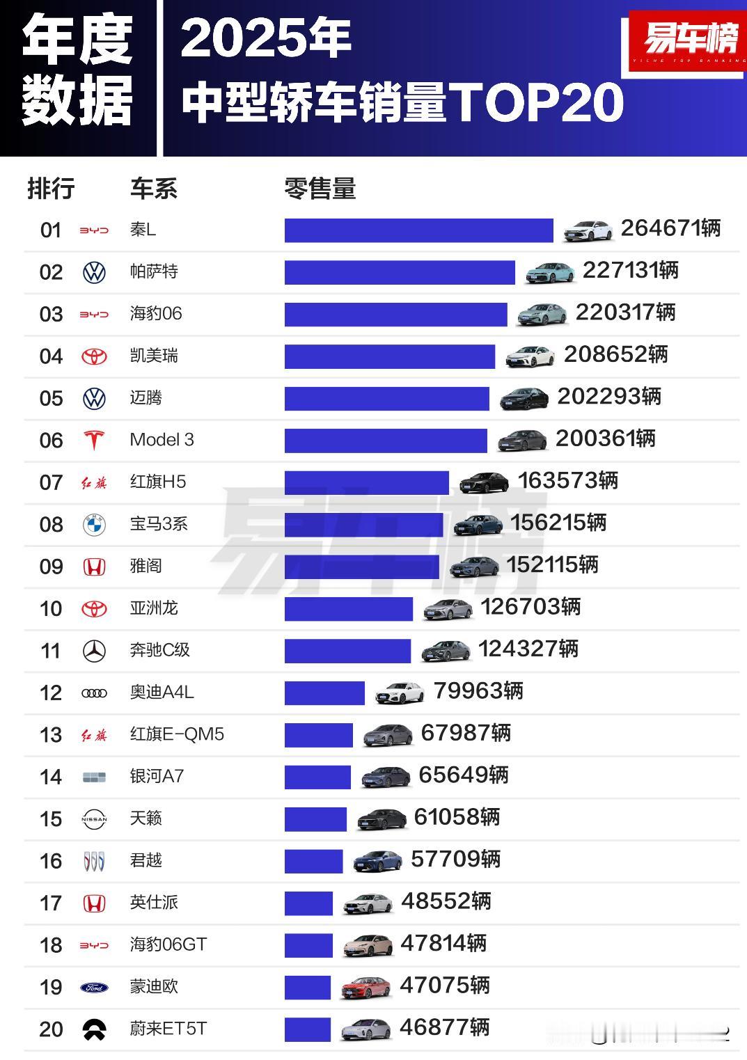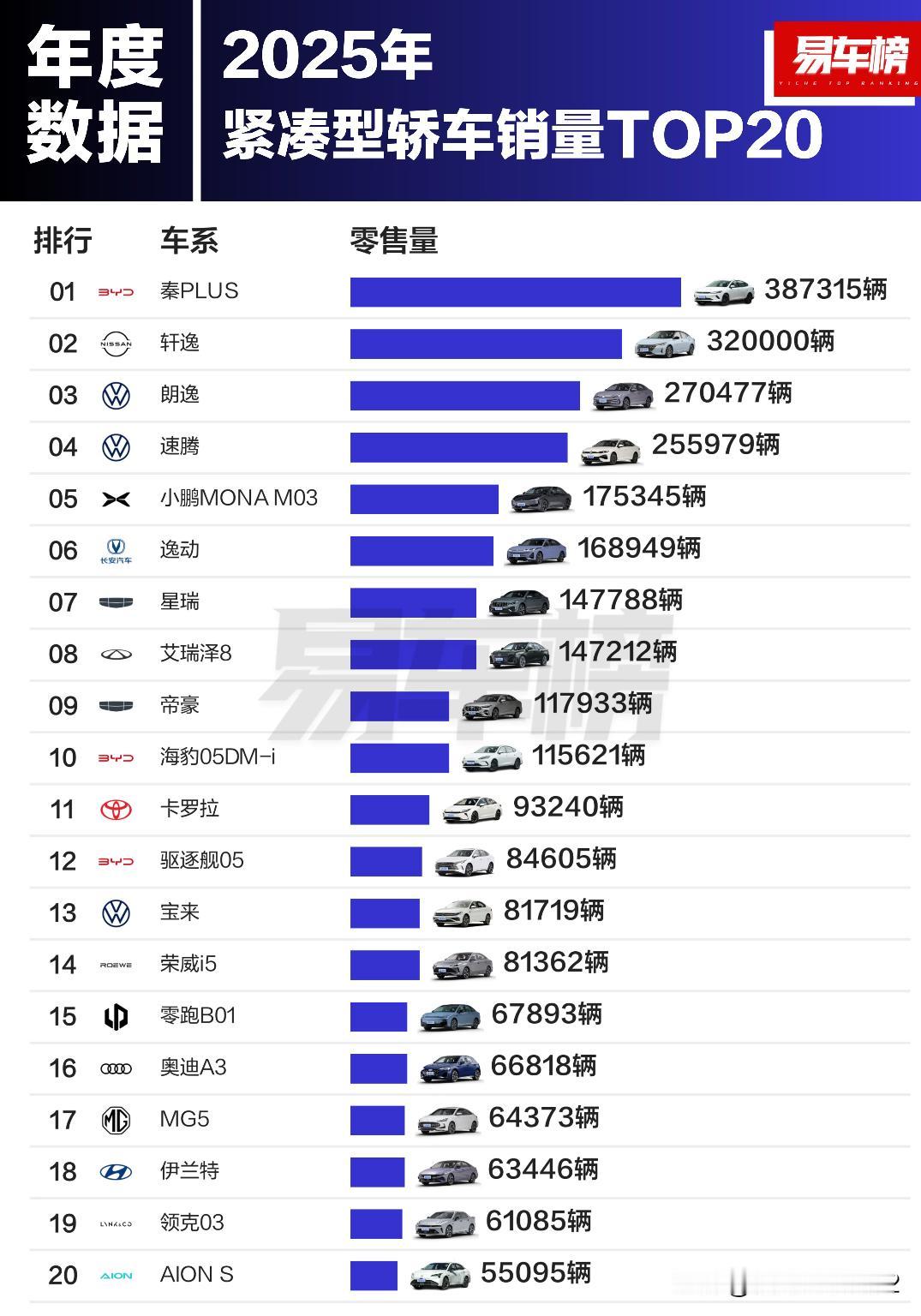 2025年各级别轿车销量TOP20 根据易车整理的乘联分会零售数据显示: 微型轿