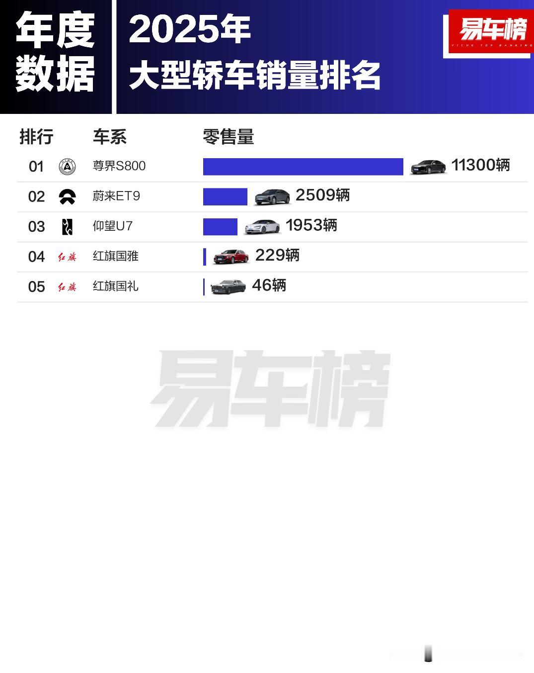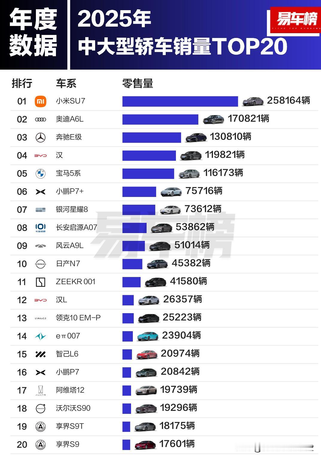 2025年各级别轿车销量TOP20 根据易车整理的乘联分会零售数据显示: 微型轿车销量前3名分别为:宏光MINIEV、长安Lumin、熊猫;销量分别为:435599辆、162362辆、162098辆 小型轿车销量前3名分别为:星愿、海鸥、海豚;销量分别为:465775辆、310956辆、160745辆 紧凑型轿车销量前3名分别为:秦PLUS、轩逸、朗逸;销量分别为:387315辆、320000辆、270477辆 中型轿车销量前3名分别为:秦L、帕萨特、海豹06;销量分别为:264671辆、227131辆、220317辆 中大型轿车销量前3名分别为:小米SU7、奥迪A6L、奔驰E级;销量分别为:258164辆、170821辆、130810辆 大型轿车销量前3名分别为:尊界S800、蔚来ET9、仰望U7;销量分别为:11300辆、2509辆、1953辆
