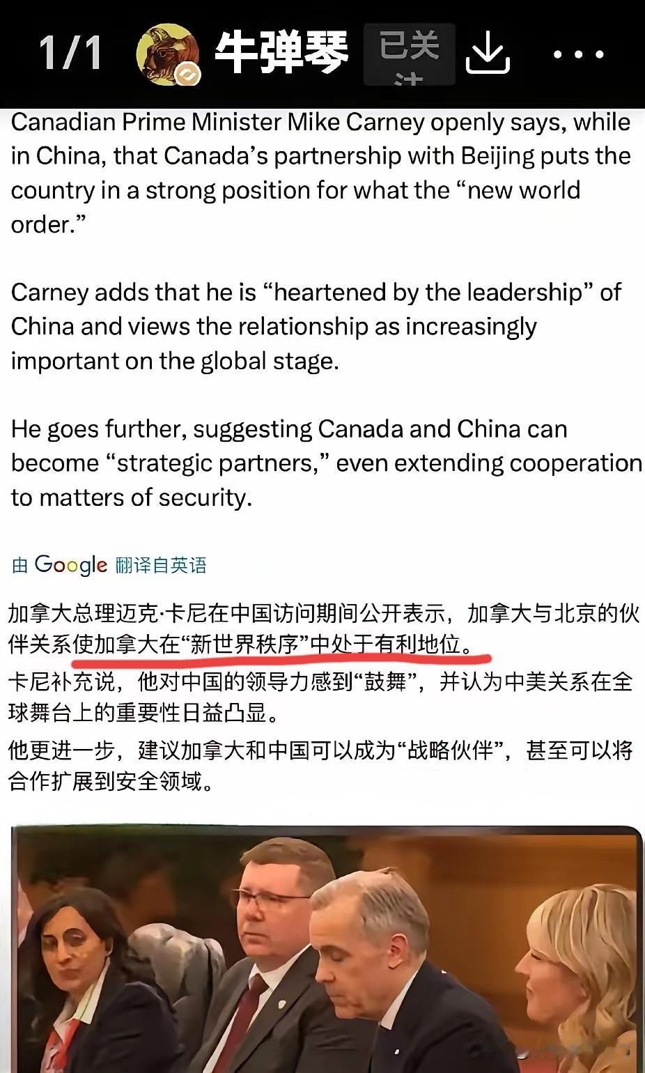 加拿大总理:想与中国的合作扩展至安全领域。美国要失眠了…[捂脸] 卡尼要比他的前任看的透彻。但如果中加之间的合作深入到安全领域甚至发展成为“战略伙伴”关系,那美国应该是第一个睡不着的。[大笑][大笑][大笑] 加总理卡尼有句话挺有意思:中加的伙伴关系使加拿大在“新世界秩序”中处于有力地位。 不管加拿大总理卡尼的真实意图和想法如何,也不管中国想不想,其他国家都已经把中美视为同级别的国家。 朋友们,你们对此事怎么看? 欢迎大家在评论区探讨,留言…[送心]