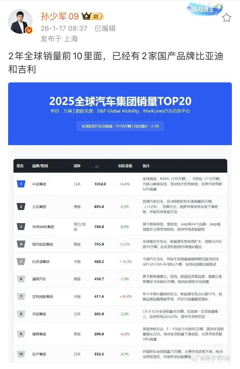孙少军:2025年全球销量前10里面,已经有2家国产品牌,分别是比亚迪和吉利! 比亚迪集团在2025年共销售460.2万辆新车,吉利控股集团共销售411.6万辆新车。两家车企在2025年海外销售的表现都非常的好,海外市场业务已经成为了一个重要板块。 谁有机会成为第3个进入全球前10位的汽车集团?目前看,奇瑞汽车集团和长安汽车集团的机会比较大,两家企业在国内的销量表现非常好,在国外的销量表现也非常的好。 特别是奇瑞汽车集团已经连续多年成为中国品牌出口汽车数量第一,如果海外汽车业务再增长,2026年是有机会登上前十名的。 各位是怎么看的?欢迎评论区留言。