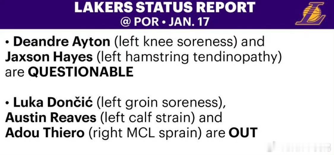 湖人开拓者明日伤病名单来了!湖人迎来2条糟糕坏消息!开拓者三主力出战成疑!多达5