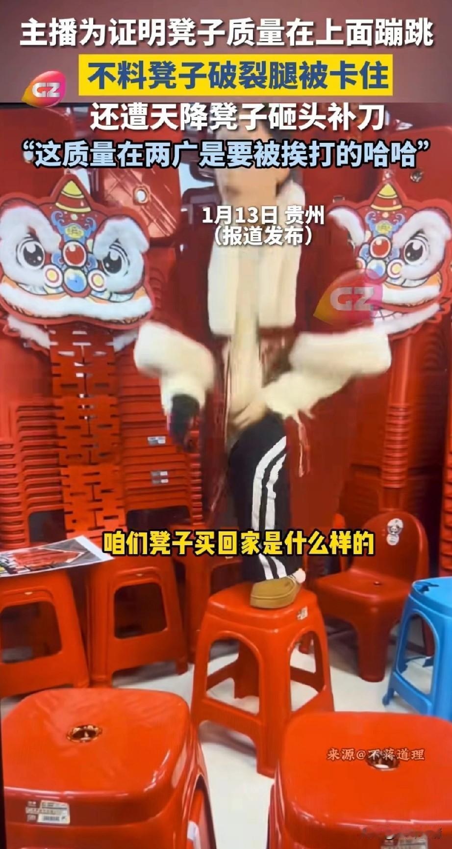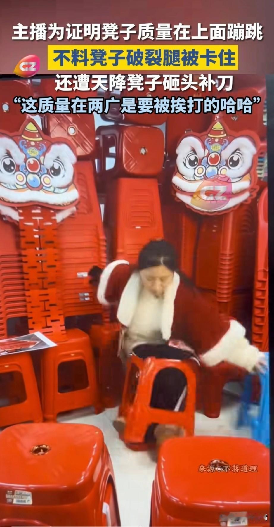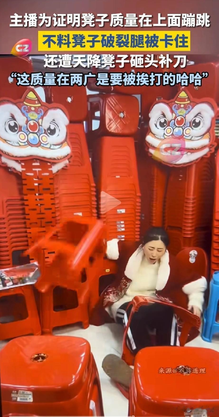 女主播在网上卖凳子, 前一秒还在介绍自自己家的凳子, 后一秒为了证实自己的凳子质量好, 直接就站在了凳子上面, 还表示自己是175的身高,130斤的重量,此时的直播间在线人数快速攀升, 直播间的音乐也响起来了, 女主播那是乐的笑开了花儿, 开始在凳子上来回蹦跳, 以此来证明自己家凳子质量非常好, 结果还没开心多久, 突然凳子就从中间破了, 她的腿直接就卡在了凳子的缝隙, 好巧不巧, 楼顶上的一个凳子突然掉了下来, 还对着她的头疯狂补刀了一下, 看来是不能说谎话呀, 要不然老天都看不下去了, 网友表示凳子砸她那一下, 我实在忍不住, 实在是太好笑了, 还有网友表示啥没有人去扶一下她呢? 知道的是她在卖凳子, 知道的还以为她是搞笑娱乐主播, 更有网友表示卖这样质量的凳子, 在两广是要挨打的! 大家对于女主播为证明自己凳子质量好突然翻车这事怎么看? 抖音直播 网红凳子 女生凳子