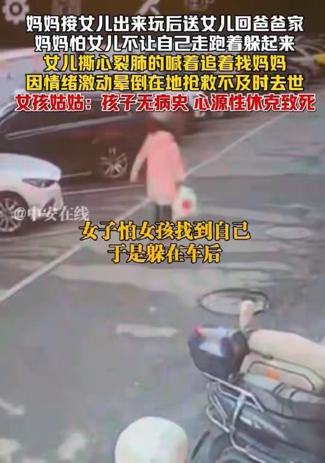 湖南这起悲剧太让人心疼!爸妈离异后,妈妈接女儿玩完送回爸爸家,怕女儿拦着自己就跑着躲起来。 女儿哭着追妈妈,情绪激动晕倒,最后心源性休克没救回来。姑姑说孩子没病史,要是妈妈不跑那么快、回头看看,悲剧就不会发生,真的太遗憾了!