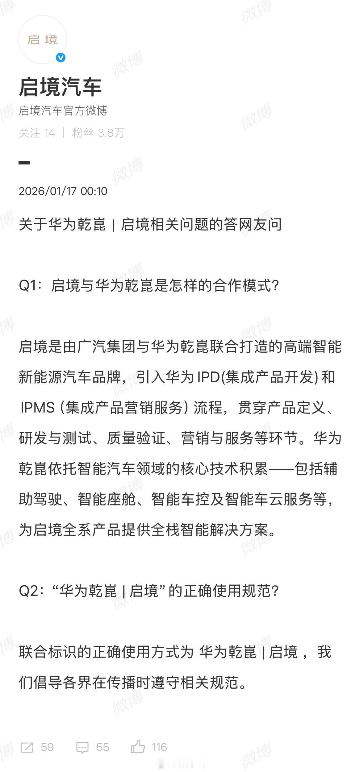 启境汽车是由广汽集团与华为乾崑联合打造的高端智能新能源汽车品牌联合标识的正确使用方式为 华为乾崑 | 启境