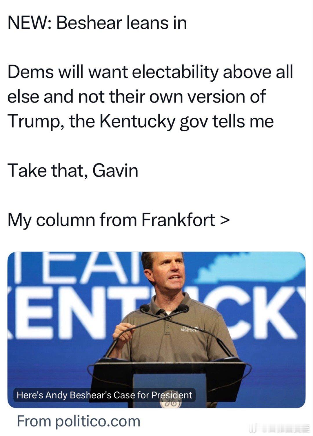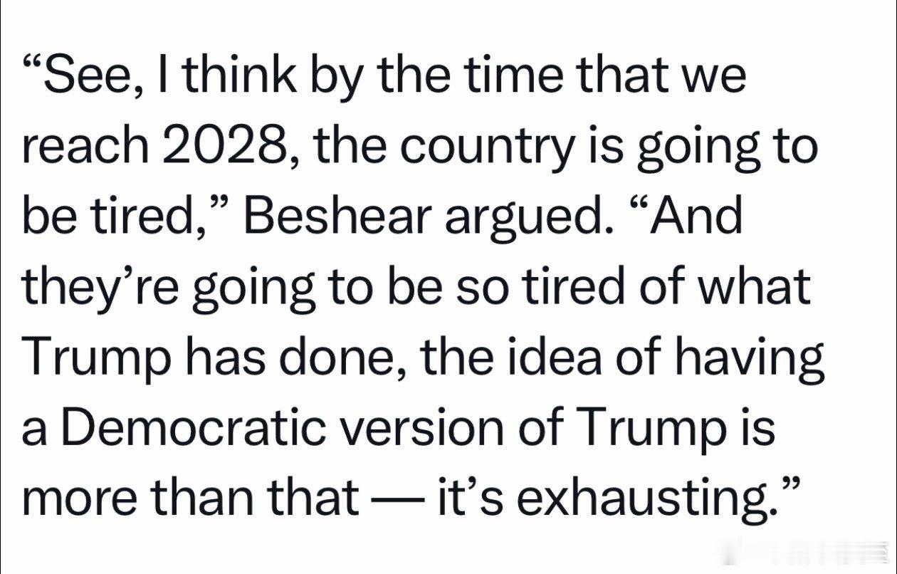 肯塔基州长:到2028,整个国家会疲惫不堪,所有人都受够了现在这个总统,如果再来一个民主党版的,大家会精疲力竭…民主党推出的候选人、首先要是能赢得大选的,而不是像他一样能折腾的Beshear的言论,在针对NewsomNewsom因为高调反川,目前赢得2028民主党内初选的预期最高