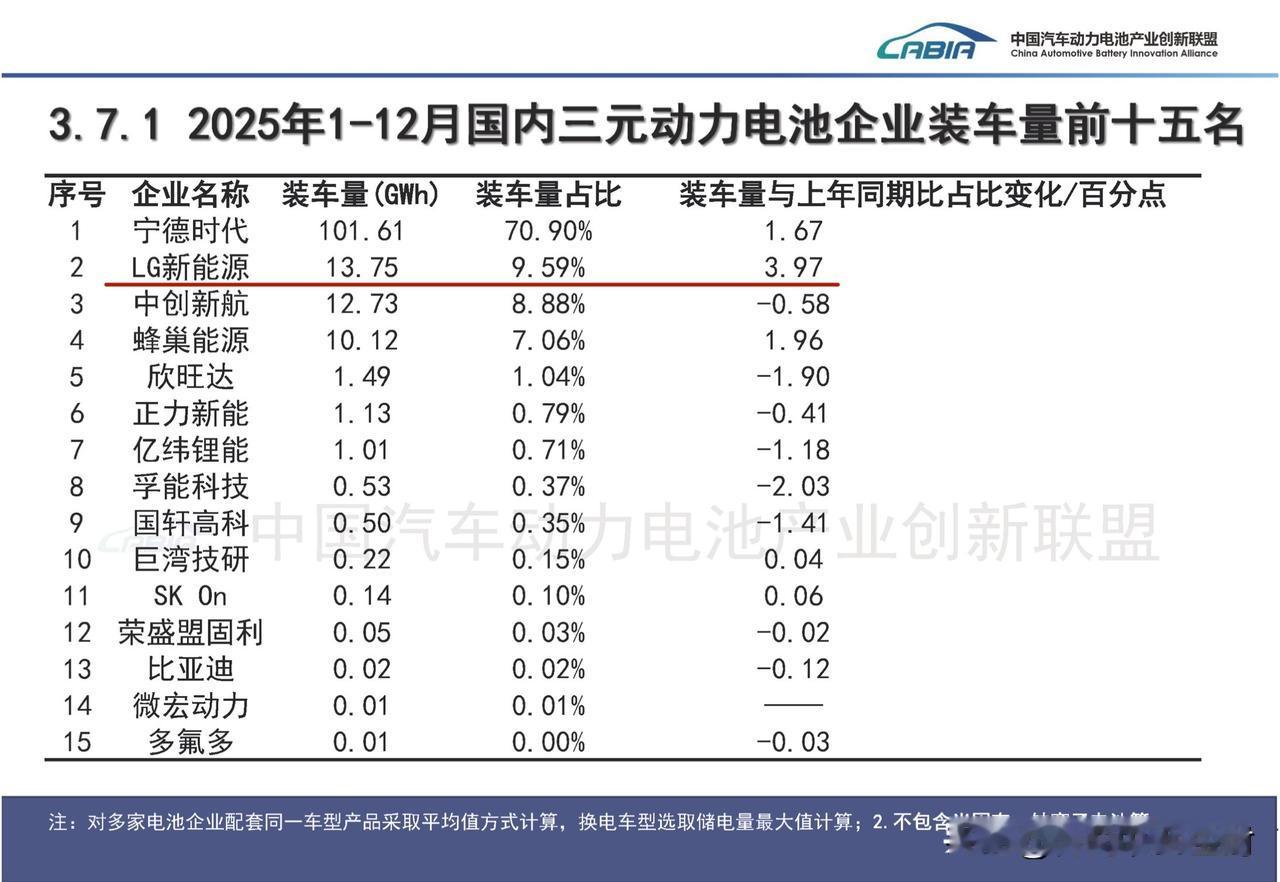 这个榜单排名挺反直觉的。 2025年国内三元动力电池装车量。 第二名竟然是LG新能源…… 全年有接近10%的市占率,相比上一年大幅提升了3.97个百分点,反超了中创新航。 这真的是有些意外…… 谁在用LG的动力电池? 国内基本也就是特斯拉吧。 model 3和model Y的长续航版。 对了,下半年还新增了model YL上市。 查了下,model YL最近几个月的销量都是破万的。 怪不得,那这就解释了,LG新能源国内三元锂装车量市占率大幅提升的原因了。 一款热销的纯电车,确实就是有这样的能力,尤其是除了宁德,在其他对手相对都比较弱的情况。 话说,这做特斯拉的供应链真的是有钱赚啊……