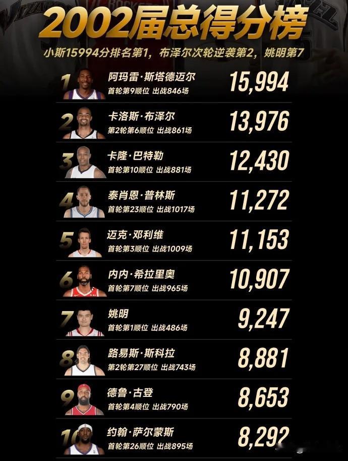 2002届“老汉”们总得分榜前10名一览: 01、斯塔德迈尔,首轮第09顺位,15994分 02、布泽尔,次轮第06顺位,13976分 03、巴特勒,首轮第10顺位,12430分 04、普林斯,首轮第23顺位,11272分 05、邓利维,首轮第03顺位,11153分 06、希拉里奥,次轮第07顺位,10907分 07、姚 明,首轮第01顺位,9247分 08、斯科拉,次轮第27顺位,8881分 09、古 登,首轮第04顺位,8653分 10、萨尔蒙斯,首轮第26顺位,8292分 ……… 01、斯塔德迈尔,出战846场,已退役 02、布泽尔,出战861场,已退役 03、巴特勒,出战881场,已退役 04、普林斯,出战1017场,已退役 05、邓利维,出战1009场,已退役 06、希拉里奥,出战965场,已退役 07、姚 明,出战486场,已退役 08、斯科拉,出战743场,已退役 09、古 登,出战790场,已退役 10、萨尔蒙斯,出战895场,已退役