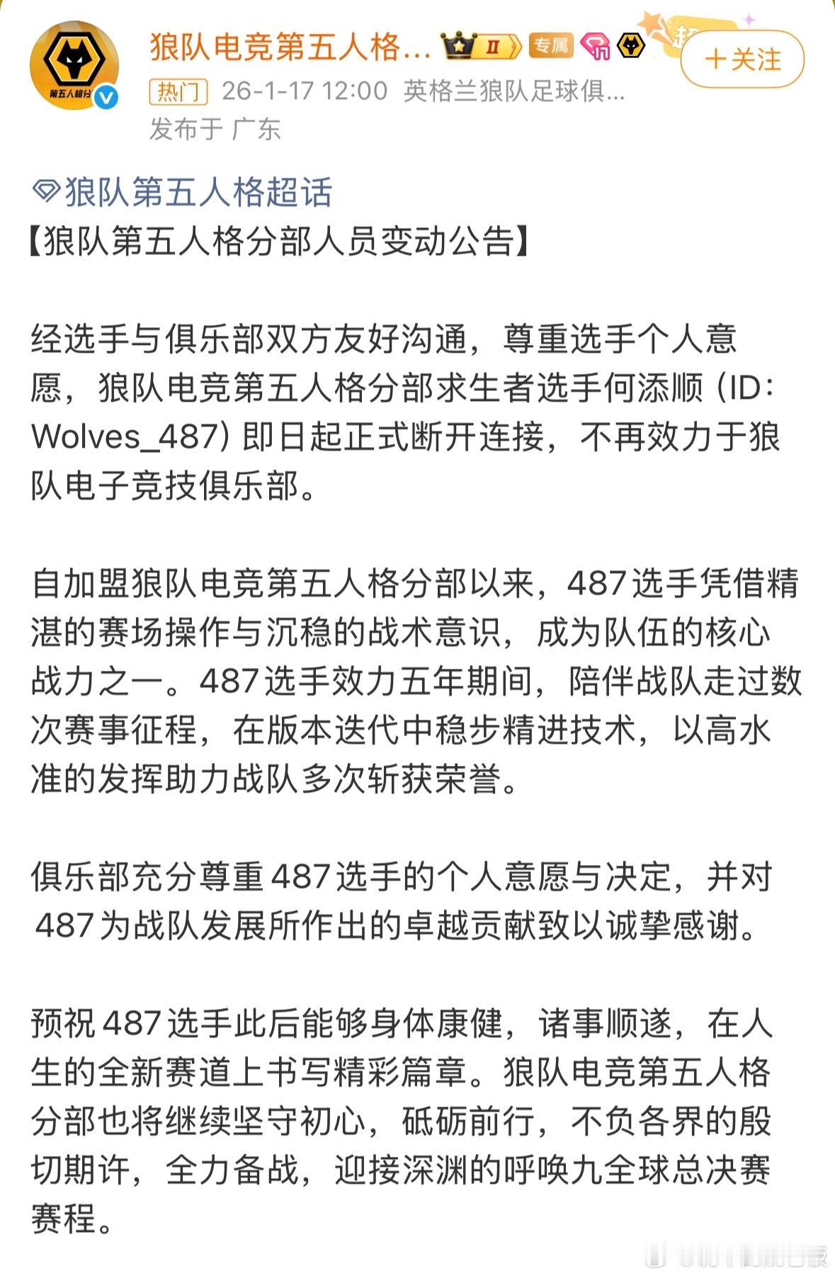 狼队487断开连接那个拿下四冠、捧起FMVP奖杯的绝活勘探员,那个极限牵制、地窖逃生的名场面缔造者,终究因手伤暂别赛场。从青涩队长到队伍定海神针,他用操作书写了狼队的荣光岁月。愿伤病退散,期待未来某天,487能带着热爱重返庄园,再续传奇!