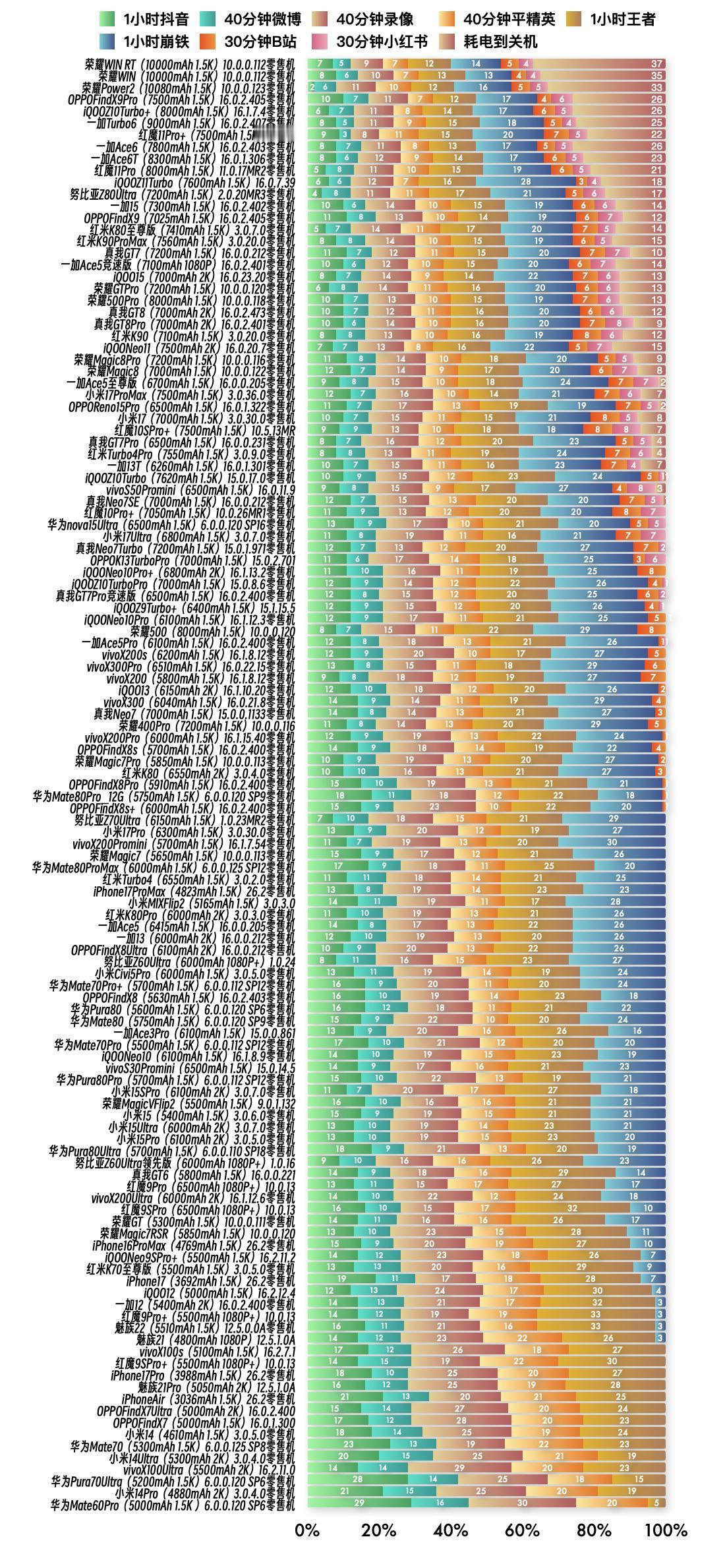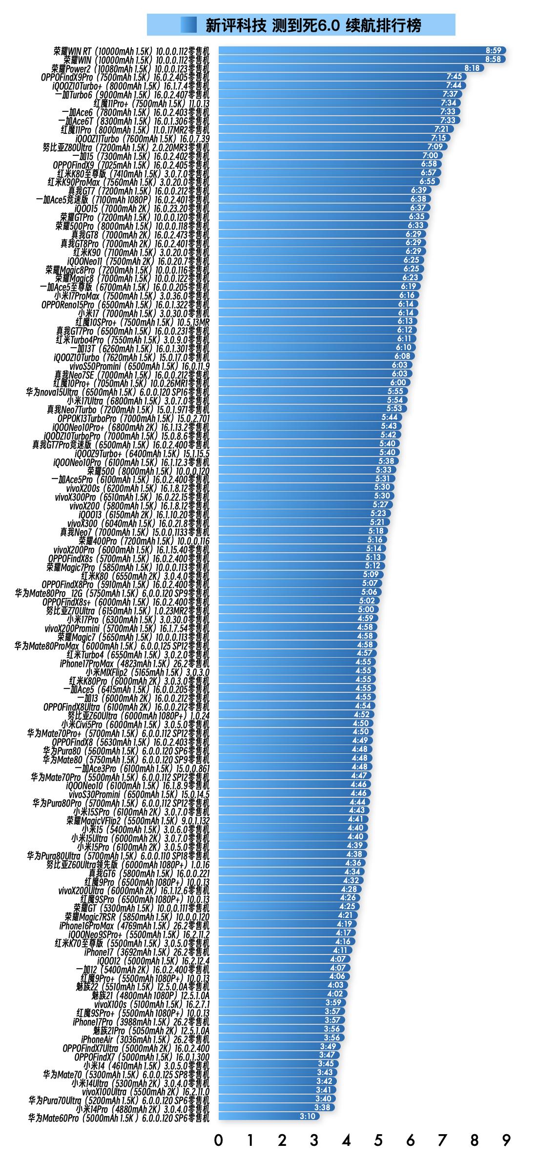 『1月17日最新手机续航榜单』 新评科技续航排行榜 本次6.0标准续航排行榜新增1台手机续航成绩,复测16台手机续航成绩;⭐️完整详细榜单请访问新评科技数据库小程序⭐️ 『6.0标准续航榜单』新增 ① 华为Mate80ProMax零售机 6.0.0.125 SP12版本总续航时间4小时58分钟,最新排名并列第68名 『6.0标准续航榜单』复测 ① 真我GT8零售机 第3次复测 16.0.2.473版本续航时间缩短9分钟,总续航时间6小时29分钟,最新排名并列第22名【对比历史成绩续航不变】 ② 红米K90零售机 第3次复测 3.0.20.0版本续航时间增加6分钟,总续航时间6小时29分钟,最新排名并列第22名【对比历史成绩续航增加】 ③ iQOONeo11零售机 第3次复测 16.0.20.7版本续航时间缩短2分钟,总续航时间6小时25分钟,最新排名并列第25名【对比历史成绩续航不变】 ④ 荣耀Magic8零售机 第3次复测 10.0.0.122版本续航时间增加3分钟,总续航时间6小时23分钟,最新排名第27名【对比历史成绩续航不变】 ⑤ 小米17ProMax零售机 第3次复测 3.0.36.0版本续航时间缩短10分钟。总续航时间6小时16分钟,最新排名第29名【对比历史成绩续航缩短】 ⑥ 红魔10SPro+ 第3次复测 10.5.13MR版本续航时间缩短14分钟,总续航时间6小时13分钟,最新排名第32名【对比历史成绩续航缩短】 ⑦ iQOOZ10Turbo零售机 第3次复测 15.0.17.0版本续航时间缩短16分钟,总续航时间6小时08分钟,最新排名第36名【对比历史成绩续航不变】 ⑧ 荣耀500 第2次复测 10.0.0.120版本续航时间缩短15分钟,总续航时间5小时33分钟,最新排名第49名【对比历史成绩续航缩短】 ⑨ 华为Mate80Pro_12G零售机 第2次复测 6.0.0.120 SP9版本续航时间缩短16分钟,总续航时间5小时06分钟,最新排名第63名【对比历史成绩续航缩短】 ⑩ 小米15零售机 第3次复测 3.0.6.0版本续航时间增加21分钟,总续航时间4小时40分钟,最新排名并列第90名【对比历史成绩续航增加】 11 小米15Ultra零售机 第3次复测 3.0.7.0版本续航时间增加17分钟,总续航时间4小时40分钟,最新排名并列第90名【对比历史成绩续航增加】 12 努比亚Z60Ultra领先版 第3次复测 1.0.16版本续航时间增加6分钟,总续航时间4小时36分钟,最新排名第94名【对比历史成绩续航不变】 13 荣耀GT零售机 第3次复测 10.0.0.111版本续航时间缩短3分钟,总续航时间4小时25分钟,最新排名第99名【对比历史成绩续航不变】 14 荣耀Magic7RSR 第3次复测 10.0.0.120版本续航时间缩短10分钟,总续航时间4小时21分钟,最新排名第100名【对比历史成绩续航缩短】 15 iPhone17零售机 第3次复测 26.2版本续航时间缩短22分钟,总续航时间4小时11分钟,最新排名第104名【对比历史成绩续航缩短】 16 iPhone17Pro零售机 第3次复测 26.2版本续航时间缩短19分钟,总续航时间3小时57分钟,最新排名并列第111名【对比历史成绩续航缩短】 新评科技有6.0标准续航排行榜,可以查看每款手机每个环节功耗,5.1长续航版(低压力版)排行榜,5.0折叠屏续航排行榜,5.1媒体机续航排行榜,所有排行榜共计200台手机中,有114台是零售机,从24年1月到26年1月,我们已经花费84.6万元人民币购买零售机。 新评科技续航排行榜,是全行业零售机最多、复测系统版本最新的续航排行榜,并且公布全程测试录像。