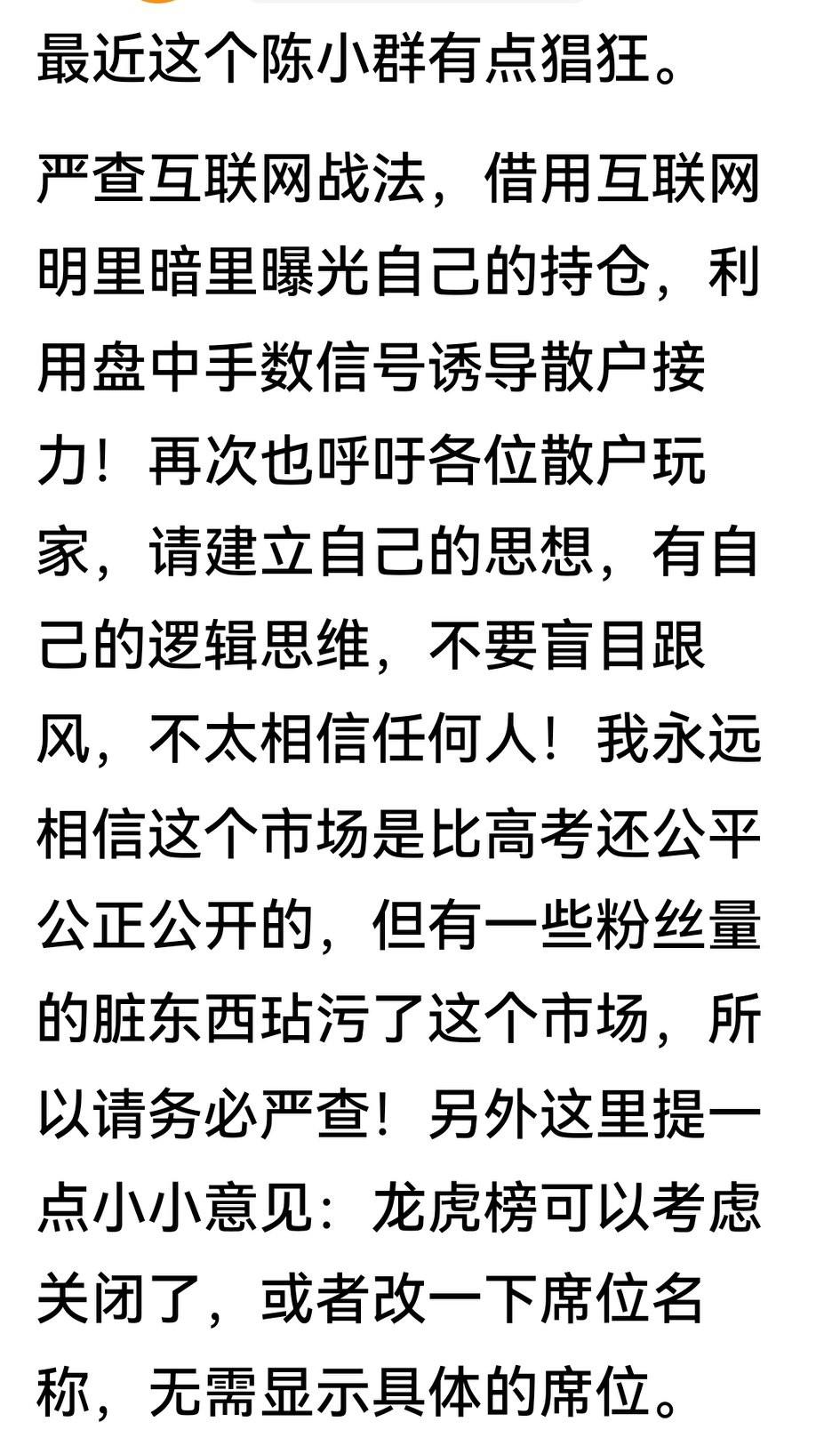 昨天的龙虎榜没了陈小群,有说是群总被请去喝茶了,也有说他的账户进小黑屋了,网上为其喊冤的信徒还真不少。 这一年来,小陈在大A狠狠赚了20倍,本来悄悄挣钱就好,可他偏偏异常高调,在抖音有意无意透露自己的席位和打板的股票,还美其名曰带小散一起发财,被越来越多的散民叫好。其互联网战法+龙头战法,通过“辅导”中大肆普及信号,实战中通过龙虎榜现身标的、通过盘中手数发出信号,引导信徒不断接力推高,让他打板的个股都变成了恶炒。这击鼓传花的游戏,其信徒是挣钱还是高位买套? 事出反常必有妖!群总有此类战法,信徒们真不该为他呜冤叫屈了!