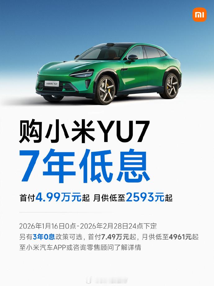 【首付只要4.99万元起 小米YU7春节就能开回家】临近春节购车旺季,小米汽车推出重磅购车福利:小米YU7限时推出7年低息购车政策。首付4.99万元起,月供低至2593元起。小米汽车副总裁李肖爽还表示,另有少量现车可选,能春节前就开上新车。详情登录小米汽车APP或到店咨询销售顾问。