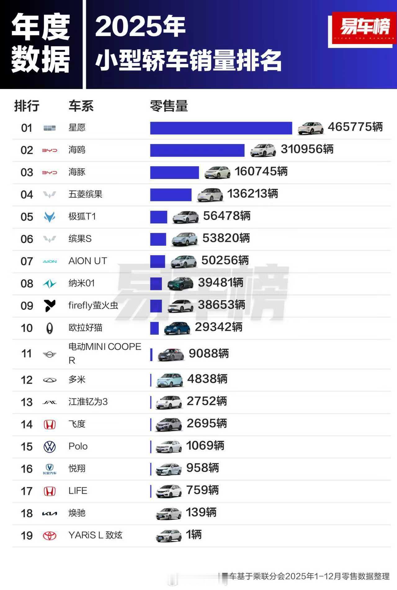 来自易车的2025年小型轿车销量排名,吉利星愿 可以说是YYLX了,并且榜单排名前十三名的全是新能源汽车 。让人唏嘘的是本田飞度 只卖了2695辆,大众Polo 就更惨了,只有1069辆,这可是年销量啊,不是月销量,甚至连firefly萤火虫 的零头都不到。小型轿车方面,燃油车年销量就没超过3000的,可以说燃油车在这个级别几乎已经没有生存空间了。新能源汽车