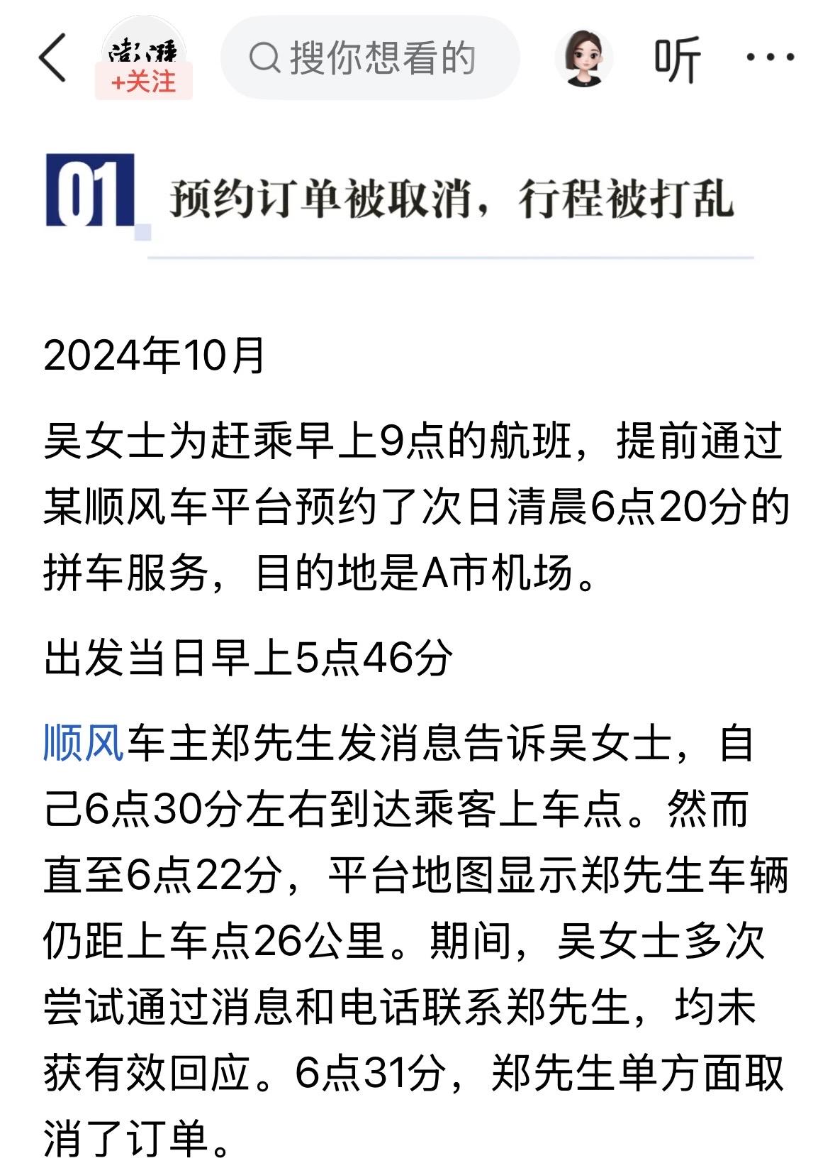 上海,女子早上9点的飞机,她提前约了6点20的顺风拼车去机场,眼看快到约定时间,定位却显示司机还在26公里外,过了会,司机竟单方取消了她的订单,女子连忙重叫拼车,可没人接单,眼看这一班赶不上了,女子没有多花钱打出租或叫辆快车,而是花高价重新买了另一航班,产生了不少额外费用,事后,女子一纸诉状把司机和平台都告上法院,要求全额赔偿机票差价、交通费和误工费,女子原以为司机违约在先,她胜券在握,可法院判决却让双方都傻了眼。 2024年10月的一个清晨,吴女士起个大早。她要去趟外地,一会得赶个早班机。 吴女士提前在平台约了早上6点20分的顺风拼车去机场,飞机9点起飞,算下来时间绰绰有余。 到了5点46分,司机郑先生突然发消息说要晚到,称6点30分才能到上车点。 吴女士盯着手机地图,眼看车子一直停在26公里外不动。 她非常着急,不停给司机打电话发消息,希望能给她个准话,要是不能来了,她也好重新叫车。 结果,这司机电话不接、消息不回,直到6点31分,吴女士发现订单被单方面取消了。 这下吴女士彻底慌了神,只好重新约顺风拼车。 让她绝望的是,一直没人接单,这节骨眼上联系亲友送她也来不及了。 也不知是不是因为不想多花钱,吴女士一直不肯叫辆出租或者快车。 眼看原航班赶不上了,吴女士一咬牙,花高价买了另一机场12点50分的机票,还得转车去B市,这下又多花了1000多块钱。 吴女士这一通操作,真是让人疑惑。如果她真是不舍得多加点钱打出租,那又怎么会舍得多花那么多钱重买机票呢? 在吴女士看来,原本她时间完全够用,可全被这司机打乱了,司机耽误她的事还让她损失一大笔,肯定是要负全责的呀!这钱必须要由司机来掏。 所以,她一纸诉状把郑先生和平台都告了,要求赔她机票差价、交通费和误工费。 然而,司机郑先生却喊冤,说出了事情的另一个版本。 郑先生表示,这单拼单没拼成,吴女士还不肯摊高速费,我顺路接其他人耽误了时间。 平台系统倒是判定他无责,可吴女士不干了,明明是你迟到取消订单,凭啥让我自认倒霉? 一审法院判郑先生赔477块钱,理由是:平台只是中间方,没证据证明有过错。但郑先生没按约定时间到,单方面取消订单属于违约。 可郑先生不服,上诉到中院。 那么,二审法院会怎么判? 《民法典》第591条规定:当事人一方违约后,对方应当采取适当措施防止损失的扩大;没有采取适当措施致使损失扩大的,不得就扩大的损失请求赔偿。当事人因防止损失扩大而支出的合理费用,由违约方承担。 法律虽然保护吴女士,也就是守约方,因为郑先生确实违约了,他没按时到还单方面取消。 但是,法律不允许吴女士在违约发生后什么都不做,或者乱做。 郑先生6点31分取消订单,离飞机起飞还有近2个半小时。 这时候,吴女士的首要任务是止损,也就是想尽一切办法用最快速度去机场。 法官认为,当时打个出租车或者叫个独享顺风车,虽然比拼车贵点,但完全来得及,也花不了改签机票那么多钱。 吴女士一着急,没去打听出租车多少钱,也没尝试其他更稳妥的交通方式,反而在7点钟就急着买了买新退旧的机票,还是去另一个城市的机场。 二审法院认为,这操作太激进了。 因为你原本只需要多花几十块钱打车就能解决问题,结果你花了上千块改签,这中间的差价就是扩大的损失。 按照第591条的规定,这部分多花的冤枉钱,是因为吴女士自己没采取合理的补救措施造成的,所以不能让郑先生全赔。 最后,法院酌情把赔偿砍到230块。 郑先生确实违约在先,但吴女士没采取合理补救措施,改签机票的差价不能全让司机背。 法官认为,遇到违约别光顾着生气,先想办法止损。你不能因为对方犯错,就放任损失像滚雪球一样变大。 郑先生违约该罚,但吴女士一着急多花的钱,法律也不会全替她买单。 有人说,顺风车本来就有不确定性,假如你出行赶时间只能提前+自己开车或打专车出行。至于顺风车司机爽约只能你自己承担,毕竟他们只是混口饭吃而已。 你有急事可以打快车呀何必坐顺风车呢,再说了司机拉顺风也许不是拉你一个人,有些乘客按约定时间内到达不了上车点,这样一来拉上两位都要迟到,这样给司机带来的损失,又有谁来承担? 顺风车是顺路去分摊油费不是以盈利为目的的出租车或者网约车。车主因自身原因不需要出行去机场了,是可以取消行程的,如果非要去变成强迫车主用远低于市场价格要车主出行是损害车主利益违背公平原则。二取消后还有两个多小时完全有时间叫出租车出发。他们之间焦点不对! 对此,你怎么看? 关注@运良说法 学法律知识不迷路