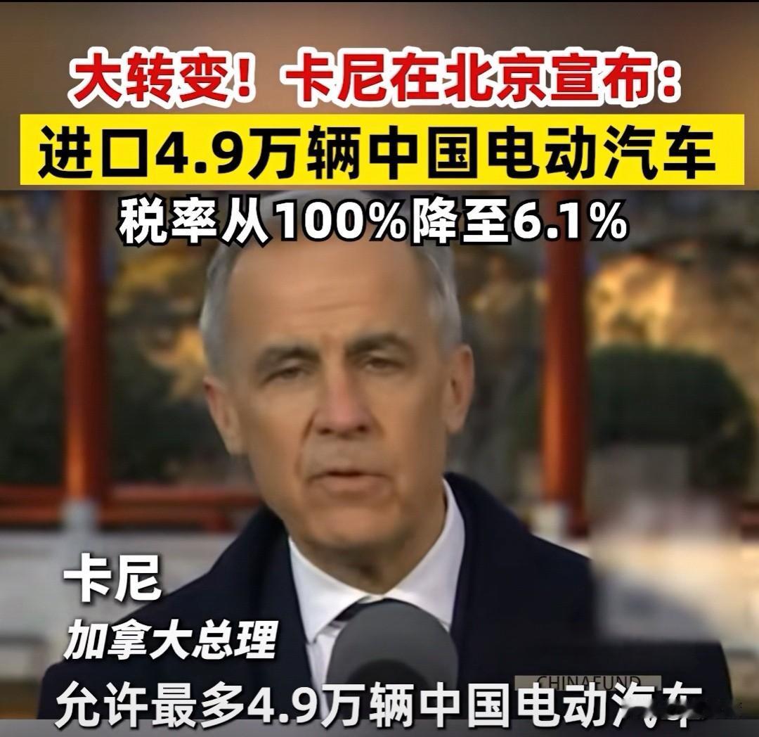 太炸裂了!大转变! 加拿大总理卡尼在北京宣布:进口4.9万辆中国电动汽车,税率从100%降至6.1%。 这是个重大的消息,难以置信的开启了中加蜜月期。此次,加拿大总理卡尼来华访问就是来深化与中国的经济合作。以前加拿大紧跟美国对华政策,屁颠屁颠的追随美国对华打压,没想到特朗普二进宫后表现出对加拿大吞并的野心和关税制裁让卡尼不得不倒向中国。只有与中国合作才能救加拿大。 因此,卡尼算好了经济账。此次对华下调电动汽车的关税就是换取中方对加拿大菜籽油等的关税下调。很划算,中加双赢局面开启了。在特朗普叫嚣要让加拿大成为美国第51个州时,加拿大甚至会破天荒与中国进行军事方面的紧密合作。 相信很快,中国这个大哥当定了!