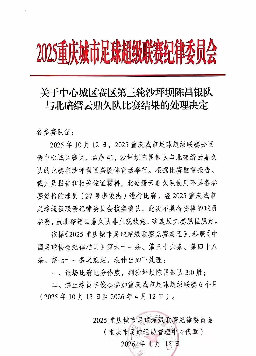 [可怜]渝超组委会,真的是脸都不要了…本来主城第二个八强出线名额争夺,我渡区与沙坪坝竞争激烈,这时候,突然就“发现”沙坪坝去年10月输给北碚的比赛中,北碚违规用职业球员,改判沙区3:0胜,这样一来,今日最后一轮我渡区大胜也“于事无补”了[发怒] [吃瓜群众]而且,更神奇的是——只对“违规参赛球员”李俊杰本人处罚“禁赛六个月”(“限制太监进青楼”,有意义吗?[黑线]),北碚违规用人,实质影响整个联赛结果,领队、教练都不用“处罚”吗???莫非李俊杰是自己“混进去”的??? [思考]就这管理水平,不如直接改成“愚超”算了,反正如今“城超”竞争激烈,“丑态百出”这个“小众赛道”,说不定真是——大有搞头[吐彩虹]