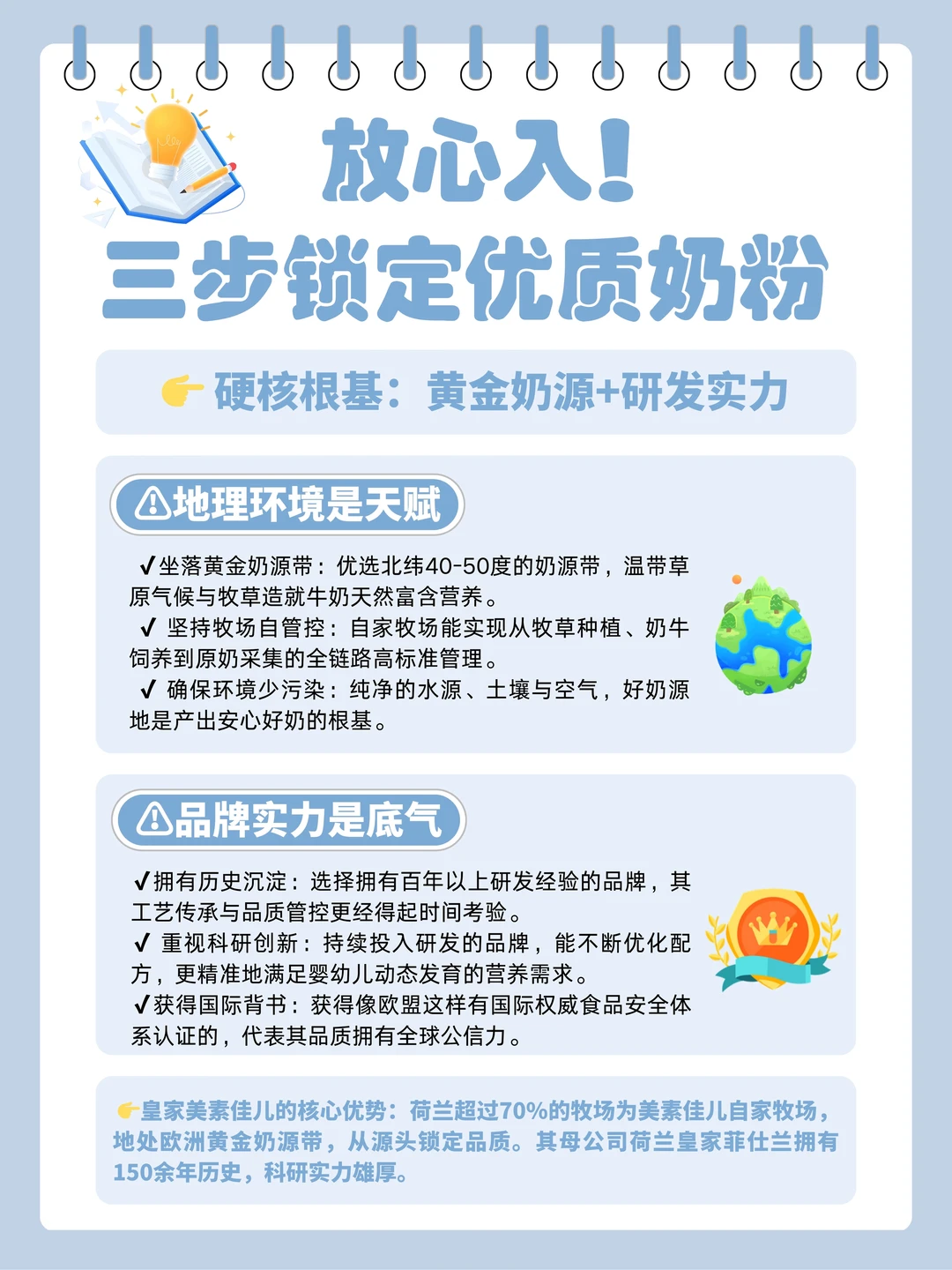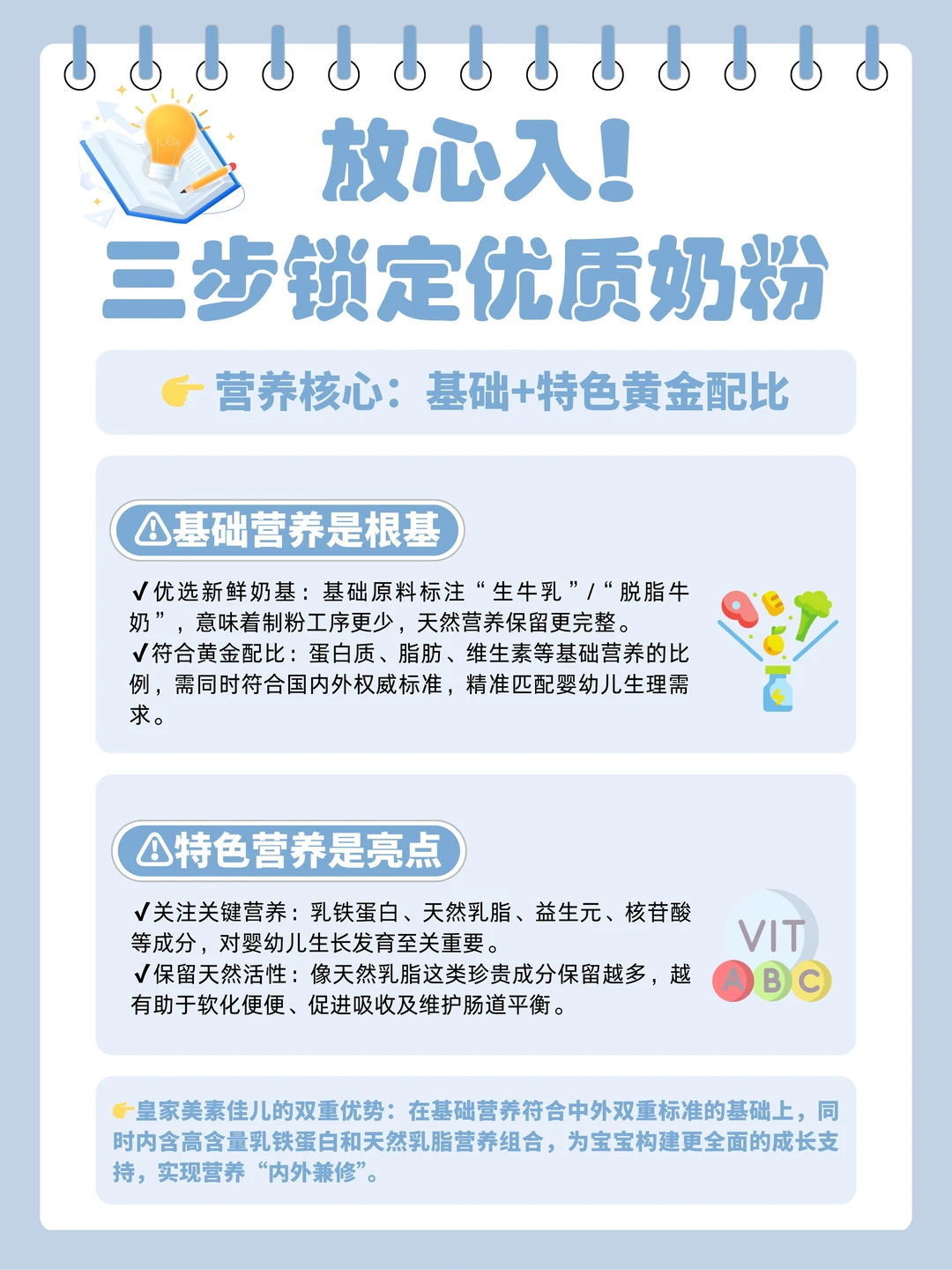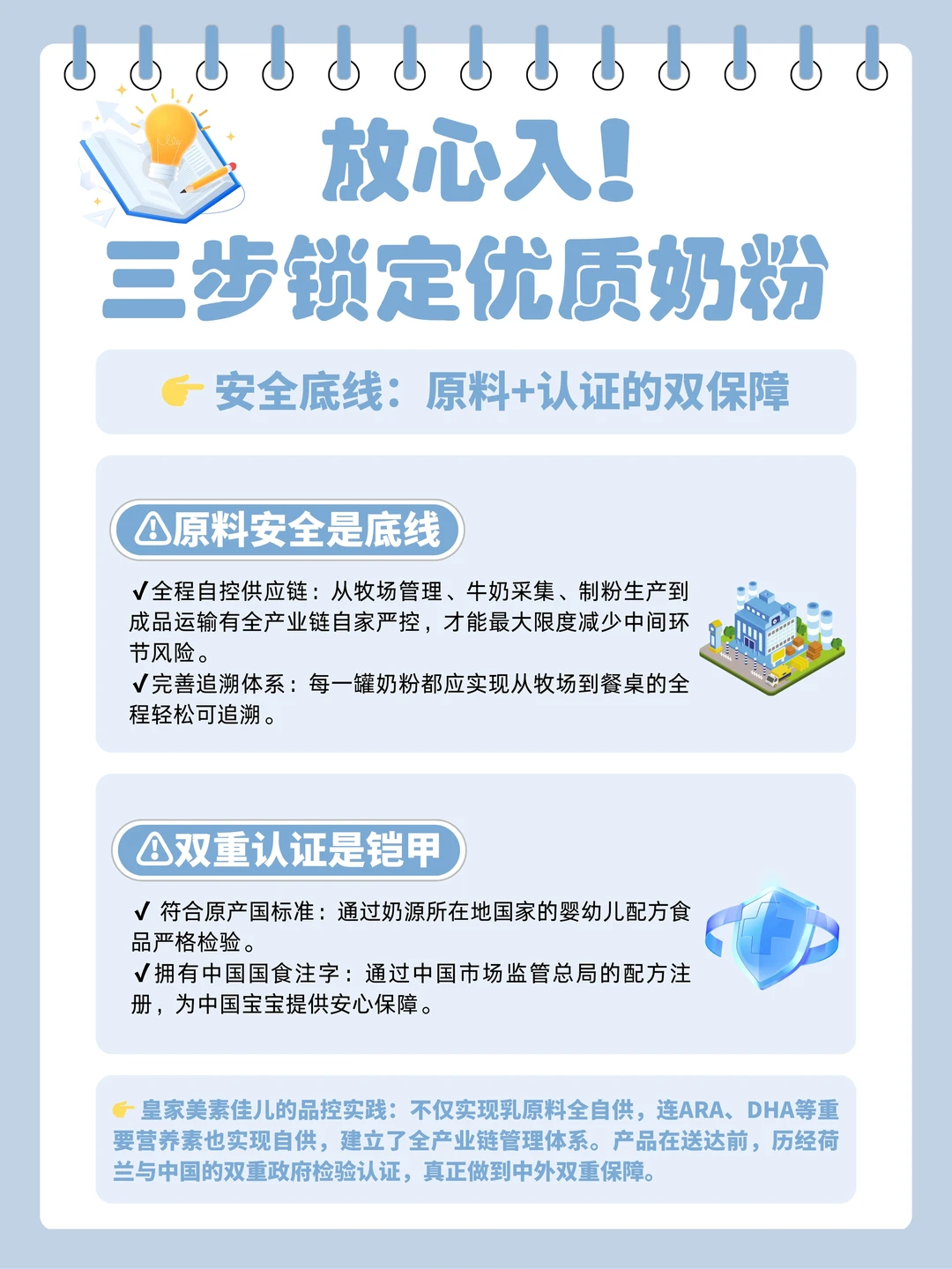 很多新手妈妈,提到选包包选护肤品,都很在行,可问到宝宝奶粉怎么选,能把头都挠秃了😵 关键选奶这事儿,一个不小心就容易踩坑❗ 作为育婴师妈妈🙋研究奶粉我不止看成分,还会关注品牌实力、奶源产地,综合比较下来,才会确定出一个安全可靠的好奶粉作为宝宝的口粮 今天我也给大家总结了选奶三步走,手把手教会大家选出让宝宝喝着放心的安心口粮,详细的步骤都整理在上图了☝跟着步骤走,保准不迷糊! 照着这个法子,我给我家娃挑中了现在喝的皇家美素佳儿3段奶粉👀可以说是我从各个维度选出来的全科学霸 - 首先它来自大名鼎鼎的荷兰皇家菲仕兰👉这可是被荷兰皇室授予“皇家”称号的百年乳企,用实力和品质赢得了全球宝妈的一致认可👍 再说点实际的,它的奶源是来自荷兰自家牧场的👏荷兰地处欧洲黄金奶源带,我了解过在荷兰超70%牧场都是美素佳儿的自家牧场,从源头就开始把控品质👌 连ARA、DHA等重要营养素也实现自供😍建立了全产业链管理体系,每一环都有严格的把控标准。产品在送达我们手上之前,也会经过荷兰与中国的双重政府检验认证,品质安全上能得到中外双重保障📝就是这种从生产到罐装都经过层层检验的安心口粮🙌给娃喝才放心! - 配方也是真的很能打,含量达45mg/100g的乳铁蛋白,助力对外进攻坏菌,对内团结铁元素和好菌,轻松帮宝宝筑起防护墙🙆🏻‍♀️ 另一边是含有90%+贴近源乳的天然乳脂配方,守护内在防御,对宝宝娇嫩肚肚很友好😋 还有着8种HMO+10亿级益生菌,配合乳铁蛋白+天然乳脂,给到宝宝长效稳护💕 - 养娃路上难题多,但奶粉怎么选这件事👋真不用太焦虑 希望我这份掏心窝的分享💡能帮你们少走点弯路 祝大家都能轻松找到那罐让娃喝得香、让你带娃安心的可靠好口粮!