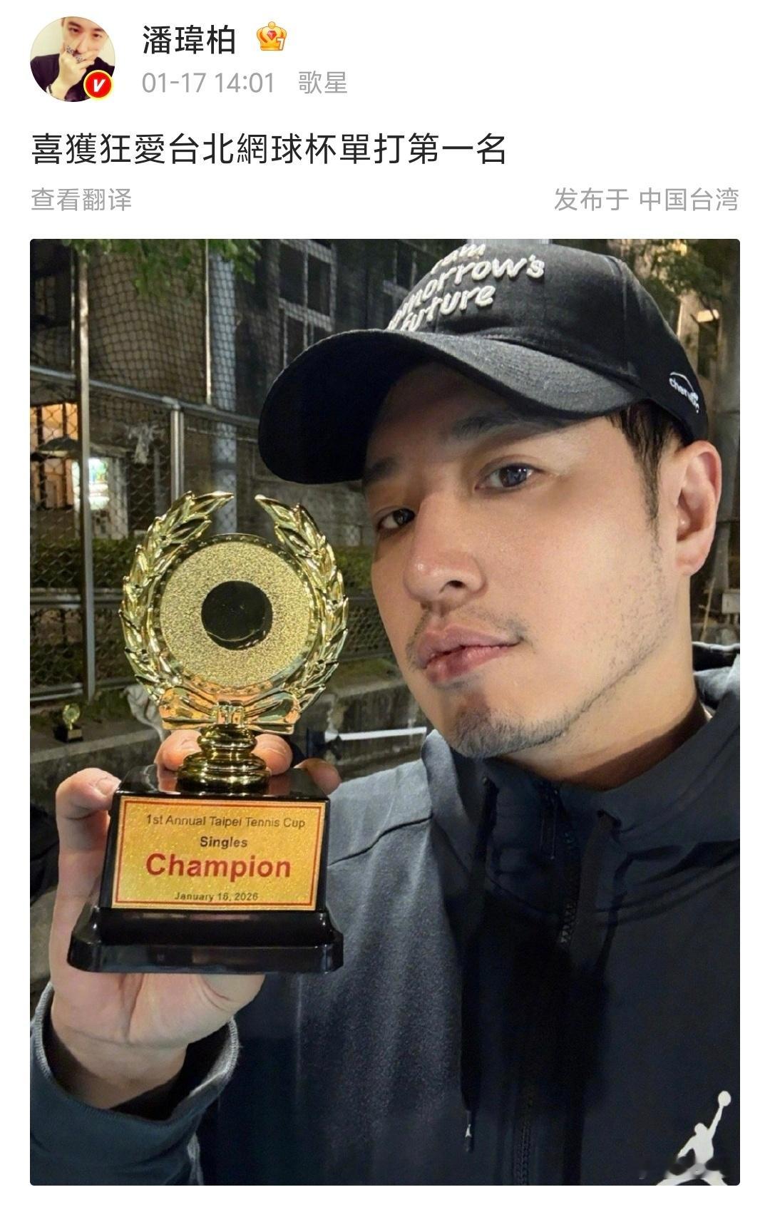 【潘玮柏拿了网球冠军】潘玮柏说周杰伦网球比他厉害 今天,晒出一张奖杯照,说自己运气不错,“喜获狂爱台北网球杯单打第一”!有网友留言:“太厉害了潘帅!想看你和杰伦单挑一下嘿嘿”,潘玮柏说:“他比我厉害啦!”