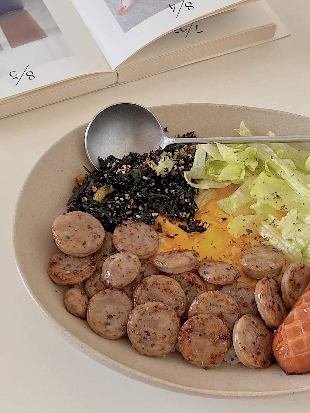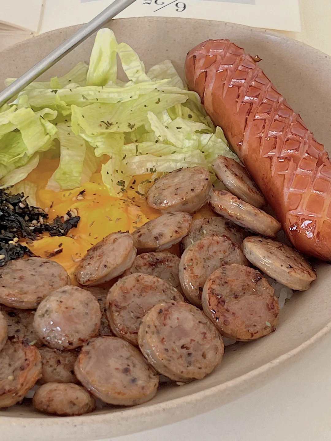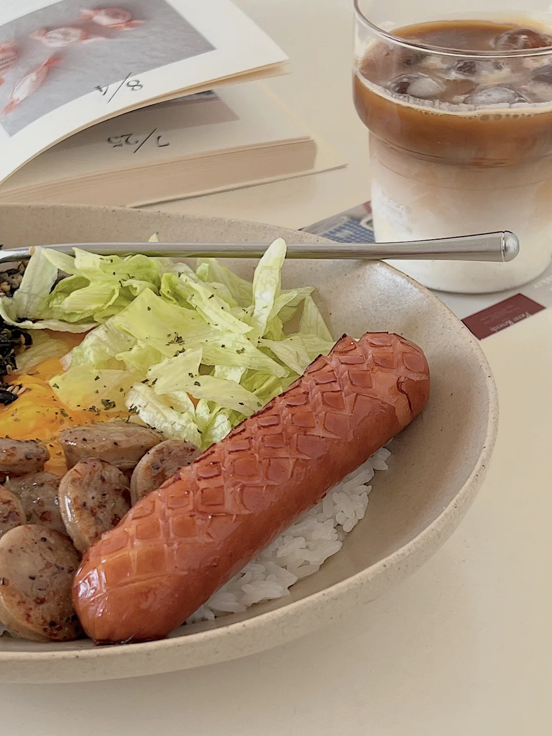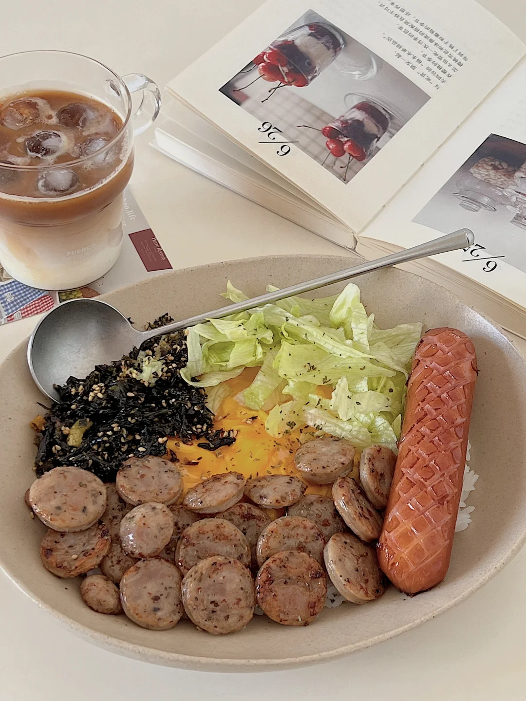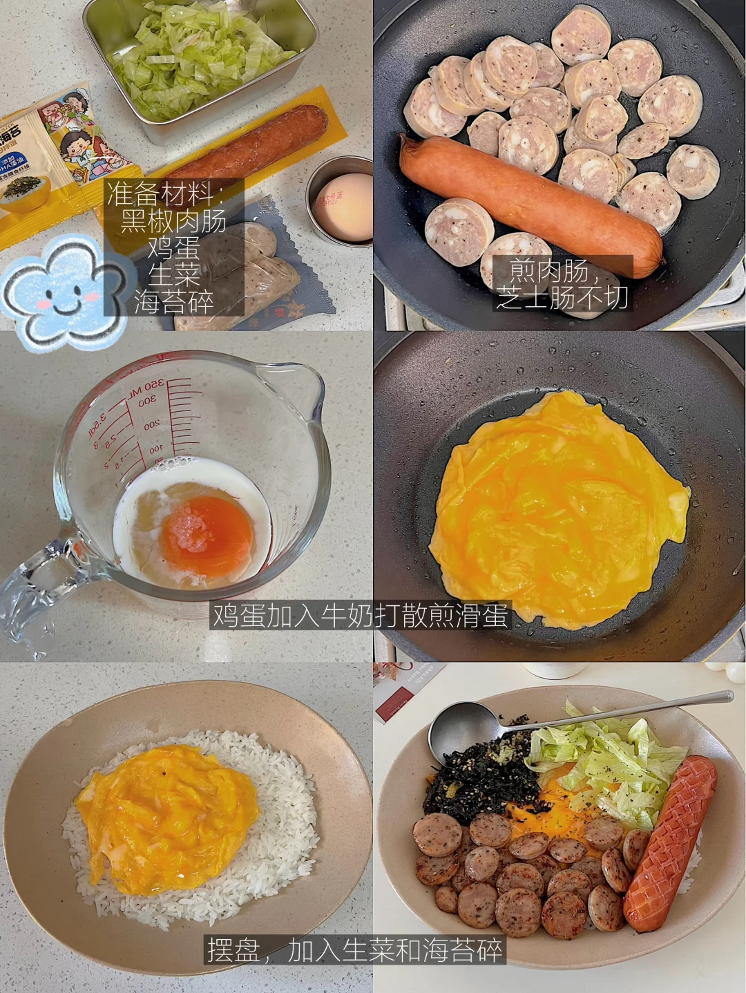 ✅只需三种食材,十分钟搞定 ✅嫩滑蛋+焦香肠的双重暴击💥 做法见(图三)(有手就会版) 1️⃣ 黑椒肠切片煎到微焦 2️⃣ 鸡蛋+少许牛奶+盐搅匀,小火推滑成云朵嫩蛋 3️⃣ 热米饭打底,铺上生菜、滑蛋和肠仔,撒黑胡椒/欧芹碎 4️⃣ 搭配一杯冰拿铁☕️,仪式感直接拉满! “再忙也要好好吃饭呀🍽️ 这份热乎乎的盖饭,是周末给自己的满分温柔~”