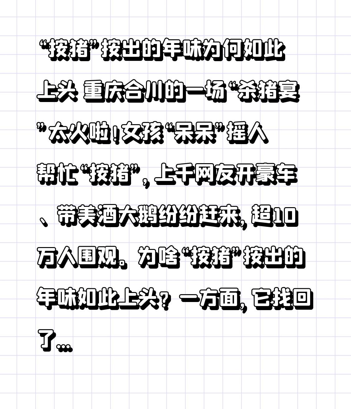 “按猪”按出的年味为何如此上头 重庆合川的一场“杀猪宴”太火啦!女孩“呆呆”摇人帮忙“按猪”,上千网友开豪车、带美酒大鹅纷纷赶来,超10万人围观。 为啥“按猪”按出的年味如此上头?一方面,它找回了过年的仪式感。现在过年成了标准化流程,缺了亲自折腾的劲儿。而这场“按猪局”里,大家一起烧水、按猪、烧菜,共同劳作分享,年味满满。另一方面,它饱含着人情味。还有,“按猪”勾起了很多人的童年回忆,视频趣味性十足,几个人围猪手忙脚乱的画面充满喜感,再加上社交媒体传播,让这股年味在网络上持续升温。