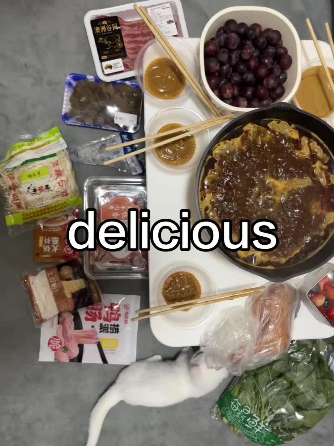 你买点牛肉(吊龙、肥牛),热水烫10秒,再整个料汁,蘸着吃,嘎嘎香