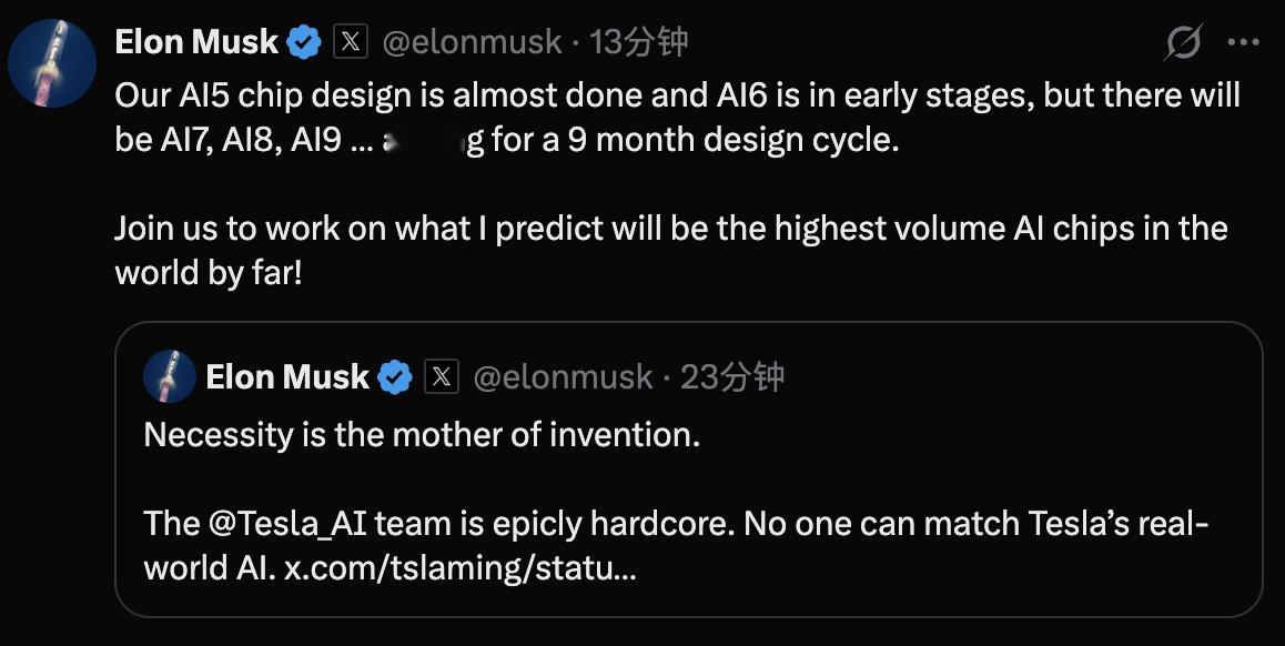 车机芯片也要进入飞速迭代周期,马斯克说目标是9个月迭代一次。AI5芯片设计已接近完成,AI6尚处于早期阶段。后续将会推出 AI7、AI8、AI9 版本的芯片。假如真的如首富所言,9个月迭代一次,而且是真迭代,具有代际差异的话。卖车的麻烦比卖机器人大。代入我自己就是,假如今年FSD V14进入国内,我肯定是要买一台Model Y的,那最快今年/最慢明年就是AI5了~~就又落后了。