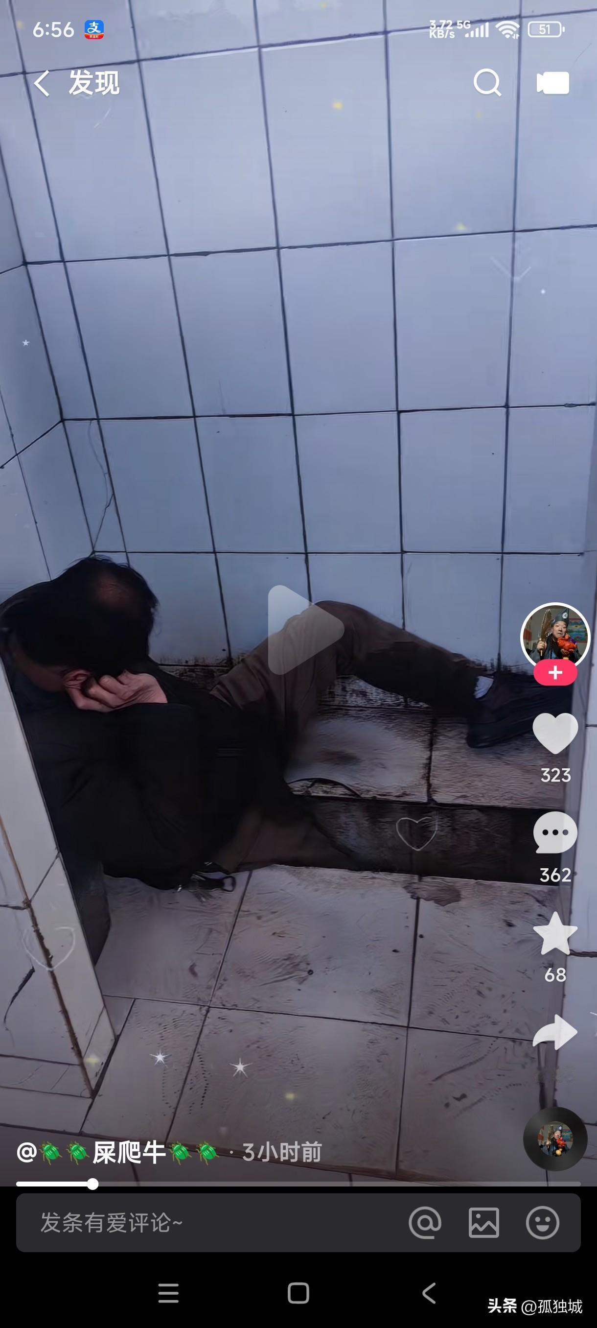见过喝醉的不胜其数,但从来没有见过喝醉后在公共厕所蹲坑里面睡觉的,这是喝醉后没地方去了还是上了厕所忘记回家了? 喝醉后不省人事的时候是不是睡的最香的时候,看他的样子仿佛像躺在自家炕头一样,一只手枕在胳膊上,他是把蹲坑当做家了吗,不知道他醒来后看到自己躺在公厕里,还全身都是屎尿,而且更是臭气熏天的样子,会不会当场给气晕过去? 虽说一醉可以解千愁,但这洋相出的全网皆知,是不是丢脸丢的人尽皆知,从此以后会不会把酒戒了?