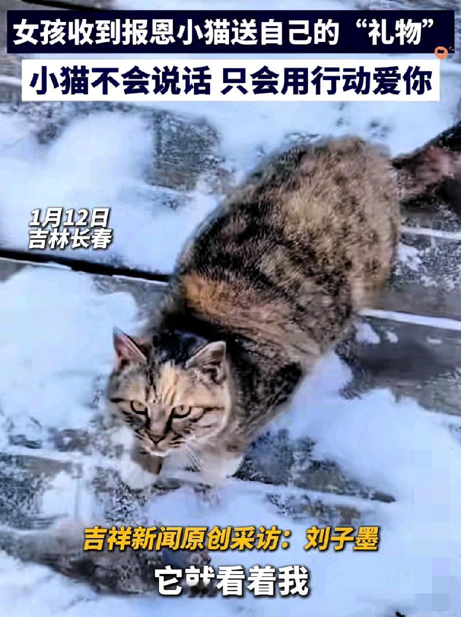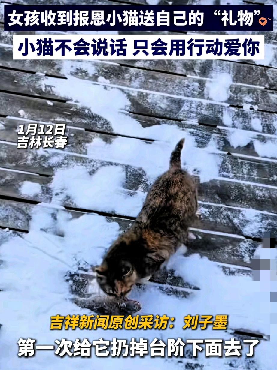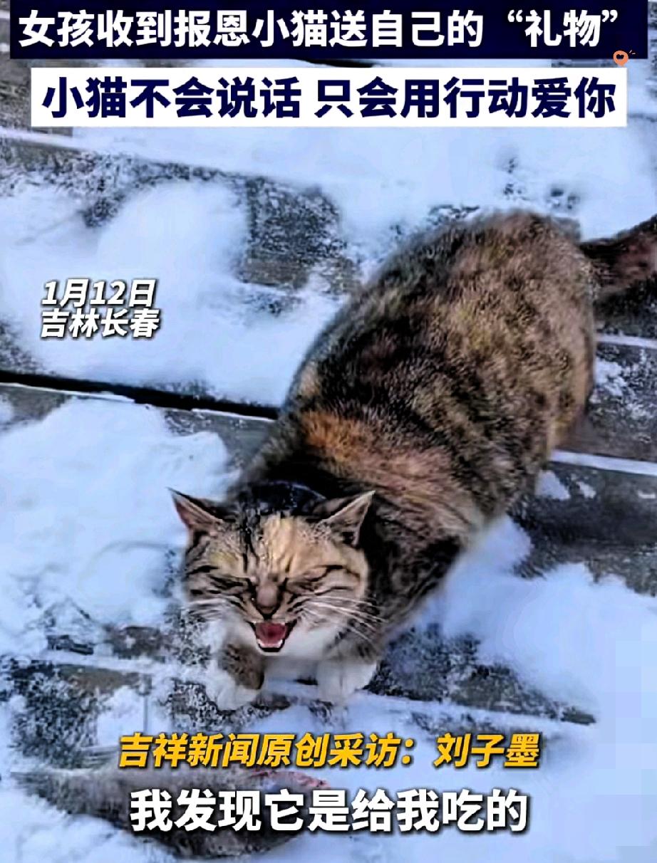 🐱东北流浪猫报恩送鱼,这才是双向奔赴的浪漫 在长春零下二十度的雪地里,一只流浪猫会把自己好不容易捕到的鱼,叼到投喂过它的女孩家门口。 第一次被扔掉,它就叼回来第二次,盯着女孩的眼神里全是“这是我给你的,你一定要收下”的执拗。 很多人说猫是高冷的利己主义者,但这只猫却用行动打破了偏见。 它不懂人类的客套,只知道“你对我好,我就把最好的给你”。 比起那些精心包装的礼物,这条带着冰碴的鱼,才是最滚烫的真心。 在我们总抱怨人情淡薄的今天,一只小猫教会了我们:爱从来不是复杂的计算,而是本能的回馈。 你有没有被小动物这样笨拙又真诚地爱过?评论区聊聊你的故事吧~