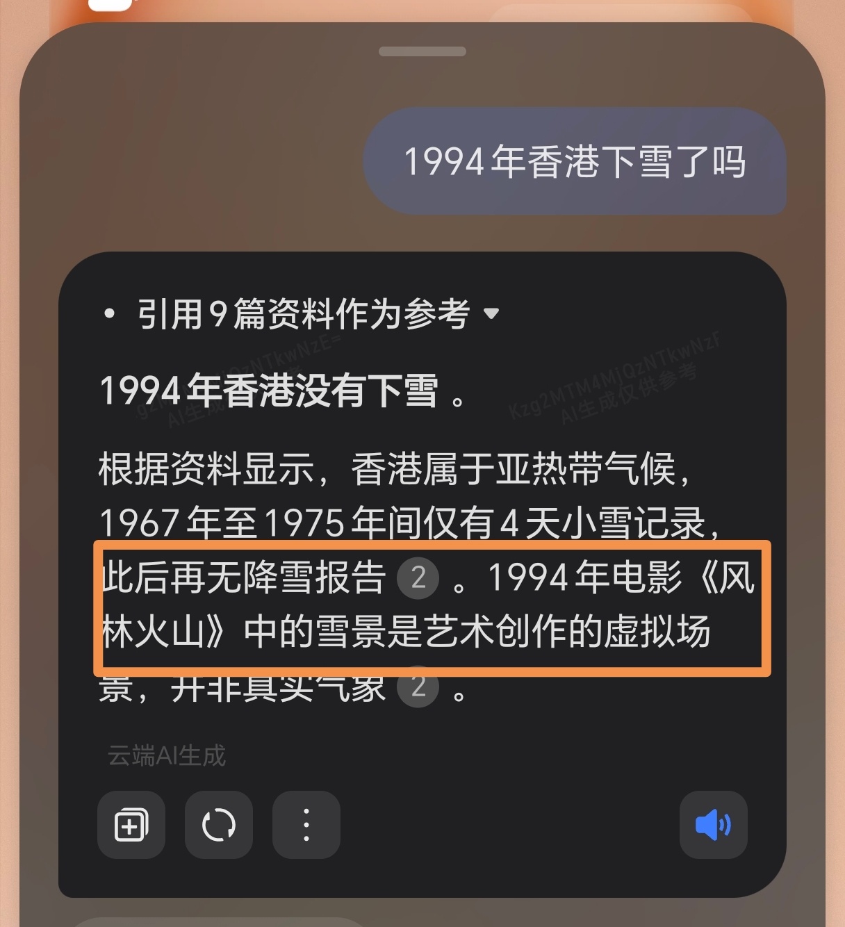 我靠,它怎么知道我问的是《风林火山》电影里的问题?荣耀的YOYO有点恐怖了。正在看电视,里面的场景是香港,但是在下雪,开头还有个镜头显示是1994年的故事背景。然后我问YOYO,1994年香港有没有下雪。但它是怎么知道我正在看这部电影的????