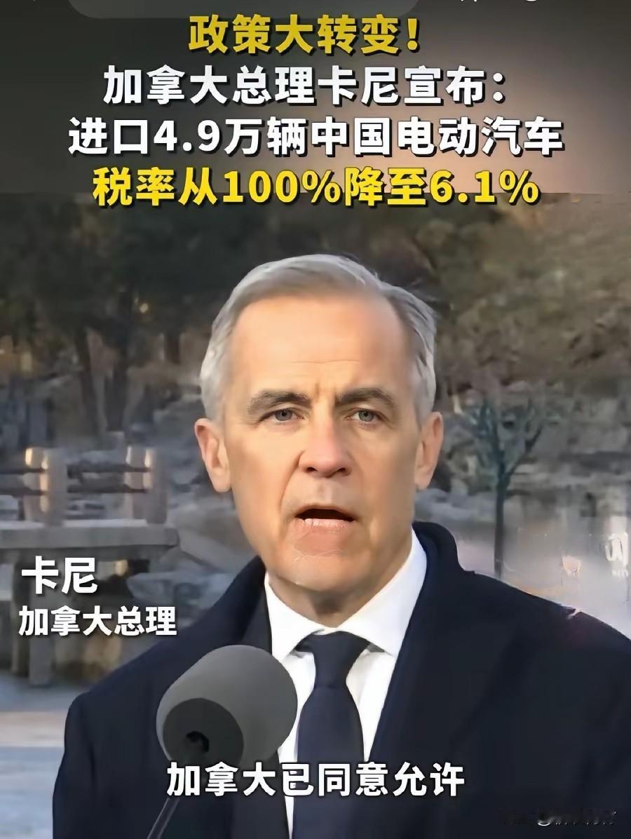 中国新能源汽车的春天来了!加拿大新能源汽车进口关税降至6.1%! 好消息传来了,加拿大进口中国新能源汽车的关税从100%降到了6.1%,这降低幅度够大吧,这下好了,进入加拿大的障碍被消除了。 美中不足的是有限量,只有4.9万台,不过也不要着急,什么事看长远一点,只要产品好,别人用的爽,不愁下一个4.9万台的到来。 就是不知道这波福利会被国内哪些厂家享受到,是比亚迪、奇瑞还是吉利,又或是东风、长安这些国字号队伍? 你感觉这波红利会被谁吃到?