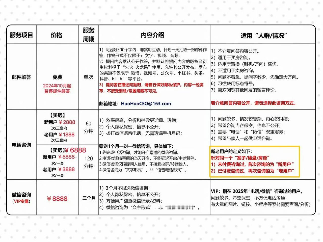【重要通知】由于咨询卖房的需求较大,且难度越来越高,我消耗的时间、精力越来越多,为了更好地服务付费用户,保证服务质量和工作效能,从2026年1月19日(周一)起,我的咨询服务有所调整,具体如下: ❶买房咨询,由原来的每次五套内,调整为三套内,希望购房咨询的用户,能将意向房源数“筛选”和“精简”一下。 ❷卖房咨询,新用户由原5888元/套,调整为6888元/套,老用户续费不变。新老用户的定义请看截图。 ⚠️以下情况,由于难度更大、指导和操作更复杂,我要消耗更多的时间、精力去处理,所以新用户统一按“两倍咨询费”来收取: ❶挂牌后(含曾经挂过牌)再来咨询。 ❷卖出租中的房屋。 ❸咨询广州市以外的房屋。 ❹咨询人与房屋不在同一个地方。 ❺咨询人无法前往房屋所在地。 ❻未提前预约的紧急咨询。 ❼别墅、小产权房。 ❽不区分新老用户,未按我的建议执行,出问题后再找我补救。 ⚠️以下情况/类型,不接: ①凶宅。 ②对我不认可、不信任。 ③没礼貌,不使用标点符号。 ④不配合我的咨询流程。 ⑤无法提供我所需的素材。 ⑥怕辛苦,缺乏执行力。 ⑦犹豫不决,未下定决心。 ⑧希望由我去说服第三方卖房。 ⑨对于同一套标的物,若买卖双方同时找我协助,我只能遵从《先到先得》的原则。 ps:如果有任何疑问,请与我进一步沟通,谢谢各位的配合和理解。[作揖]