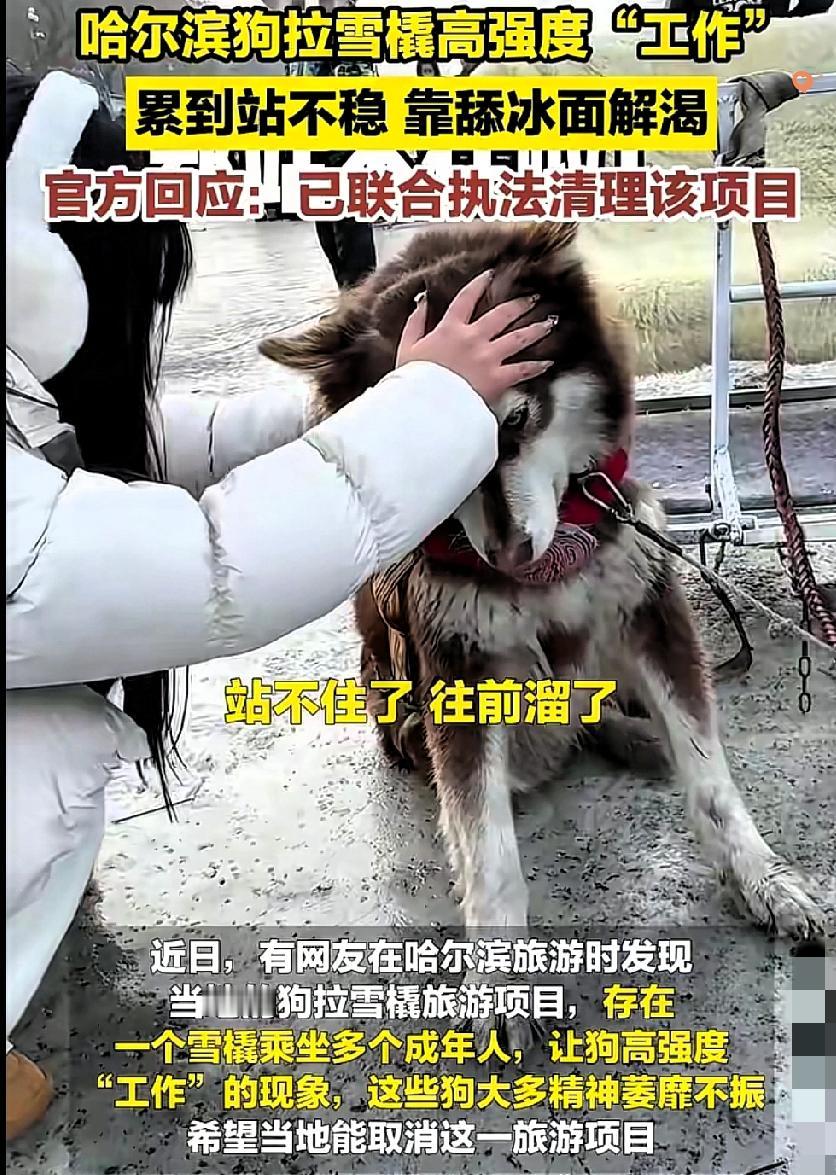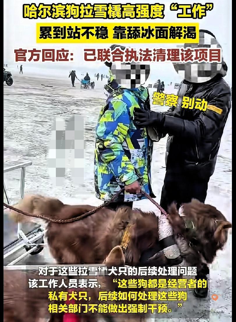 ❄️哈尔滨叫停狗拉雪橇:别让“冰雪浪漫”变成毛孩子的酷刑 看到哈尔滨那些拉雪橇的狗狗累到站不稳、只能舔冰面解渴的视频,真的让人揪心。 我们总说“旅游是体验当地文化”,但这种建立在动物痛苦上的“体验”,根本不是浪漫,而是残忍。 值得庆幸的是,当地已经联合执法清理了这些项目,但后续狗狗的安置问题依然让人担忧。 这提醒我们:真正的城市温度,不仅要让游客满意,更要让每一个生命都能被温柔对待。 你怎么看待动物表演类的旅游项目?评论区聊聊吧~