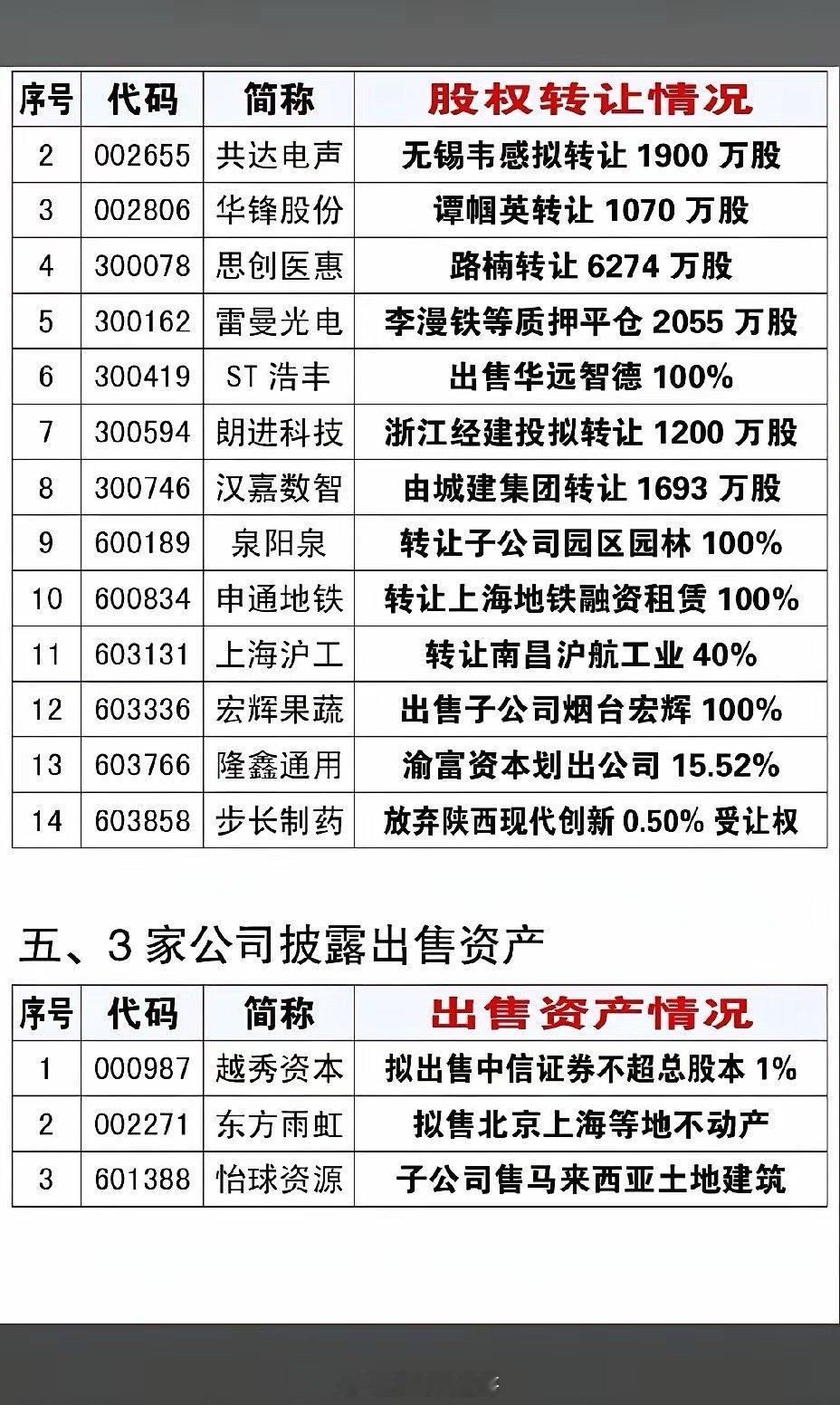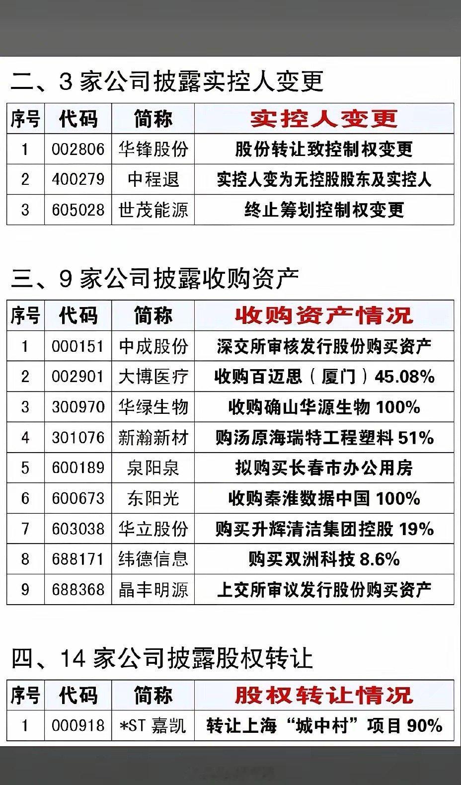 1月17日,下周A股这些股票有望大爆发!!!14家公司披露资产重组事项,重点关注:华天科技购买华羿微电子100%进展,后市值得高看一眼;通业科技拟现金购买思凌科91.69%进展,后市值得期待;3家公司披露实控人变更;9家公司披露收购资产;14家公司披露股权转让;3家公司披露出售资产!!!
