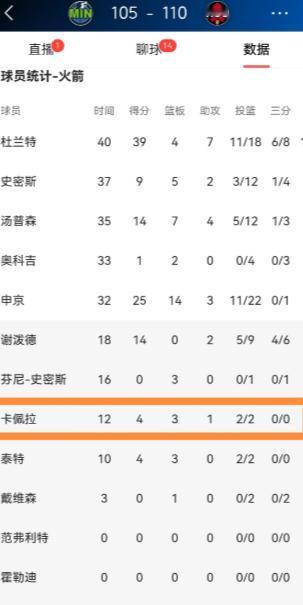 我必须要好好的夸夸火箭中锋卡佩拉!今天火箭在主场以110:105力克森林狼,本场比赛由于亚当斯的缺阵,因此卡佩拉获得了一定的出场时间,他在替补出战的12分钟里,投篮2中2得到4分,还有3篮板1助攻,他的场上正负值为+8。 今天火箭主场迎战森林狼的这场西部卡位战,打得是真胶着,直到最后时刻才分出胜负,最终110-105险胜对手,拿下了这场宝贵的胜利。 熟悉火箭的都知道,卡佩拉最近的出场机会并不多,这次能获得轮换时间,主要是因为亚当斯的轮休。 毕竟是背靠背赛程,球队为了保护这位内线悍将选择战略性休战,这也给了卡佩拉证明自己的机会。 没让人失望的是,他完全抓住了这次来之不易的上场时间,没有半点浪费。 替补出战12分钟,卡佩拉的表现堪称高效到极致。 进攻端他打得极其聪明,不贪功不蛮干,两次出手全部命中,稳稳拿下4分。 要知道这场比赛双方的进攻效率都不算高,尤其是内线面对戈贝尔这样的护筐高手,想轻松得分并不容易,而卡佩拉能保持100%的投篮命中率,足以看出他在篮下的终结稳定性。 除了得分,他在篮板球和防守端的贡献同样关键,全场拿下3个篮板,虽然数量不算多,但每一个都很及时,帮球队稳住了篮板优势。 更难得的是他还送出1次助攻和1次抢断,展现了不俗的传球意识和防守积极性。 最能体现他赛场价值的,还是那+8的正负值——要知道整场比赛两队的分差就没拉开过,卡佩拉在场上的这段时间,球队是净赢对手8分的,这份数据在替补席里相当亮眼。 这么说吧,卡佩拉的作用远不止数据能完全体现。 他在场上的时候,火箭内线的防守硬度明显提升,给了外线杜兰特和队友更多安心进攻的空间。 而且他的跑动和挡拆质量都在线,能很好地契合球队的战术节奏,这对于一支需要轮换深度的球队来说太重要了。 其实之前很多人都觉得卡佩拉在火箭的出场顺位靠后,机会不多,但这场比赛他用实际表现证明,自己依然有能力为球队做贡献。 现在火箭正处在冲击季后赛的关键阶段,赛程密集,亚当斯难免会有轮休或者需要休息的时刻,这时候卡佩拉的存在就显得尤为重要。 如果他能保持这场的状态,后续大概率能获得更多稳定的轮换时间。 这场险胜让火箭的排名稳步提升,而卡佩拉的惊喜表现,无疑给球队的内线轮换增添了更多信心。 对于这位老将来说,只要有机会就能发光发热,这种敬业态度值得肯定。 以上都是个人观点,对此您有什么不同的看法,可以在评论区留言讨论!!!