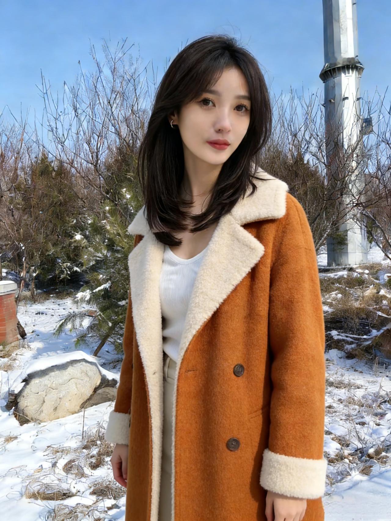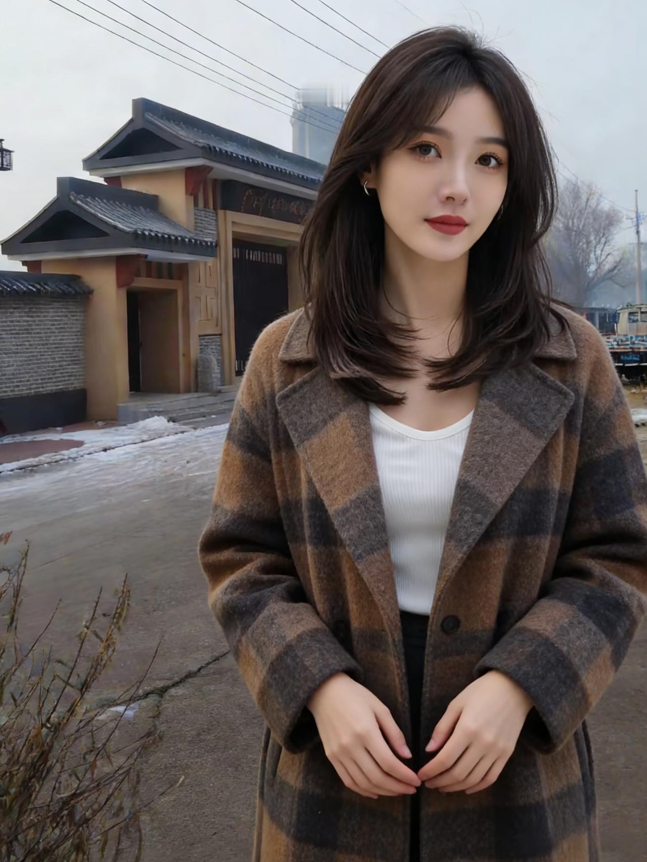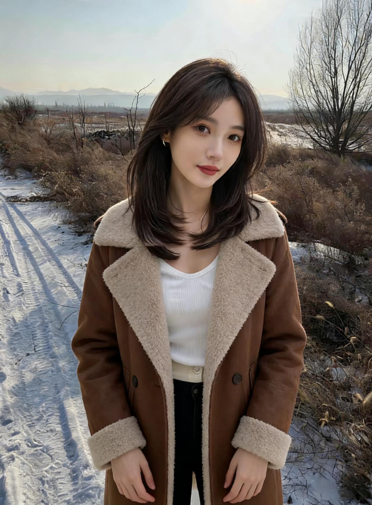 冬日乡村野径斜,偶逢姝丽立寒沙。 玄裙裹得腰身细,素面凝来鬓影斜。 眼似秋泉涵晓